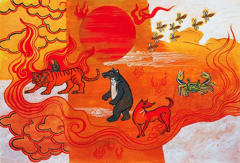 The revived Thunder God awoke to see a swarm of buzzing Bees, a Crab with its pincers raised, a Tiger with outstretched claws, a Bear and a Fox with large teeth, and an ugly Toad. The God was so scared He ran and hid behind the Emperor’s golden throne.