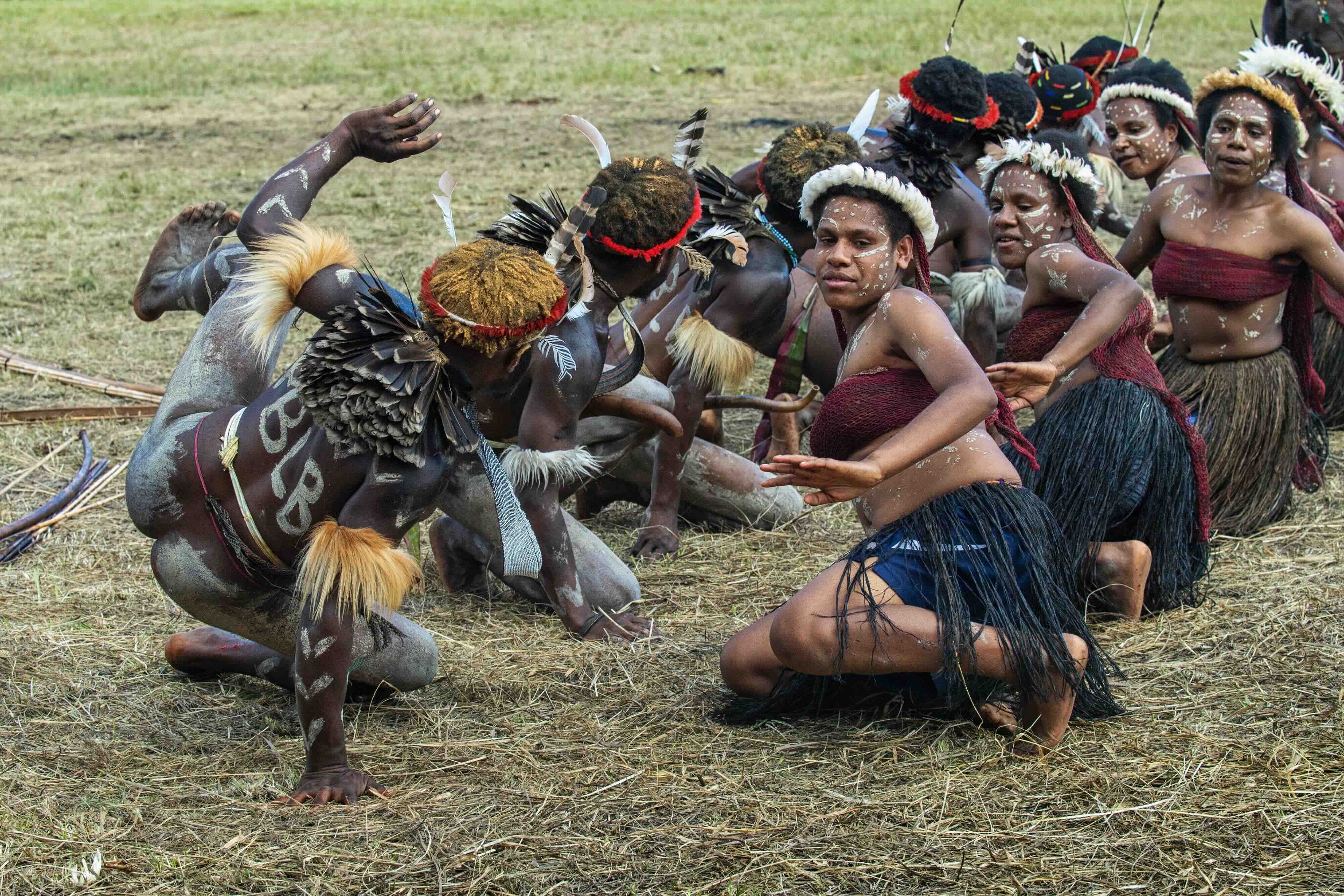 Performers don’t wear elaborate clothing or flashy makeup. Everyone wears the same simple traditional attire. The women don skirts woven from straw or tree bark, with bare chests, while men also go topless and cover their private parts with a dried gourd (koteka). Both men and women wear jewelry made from shells, bones, seeds, and colorful feathers. Warriors pierce their noses with wild boar tusks, believing this grants them absolute strength.