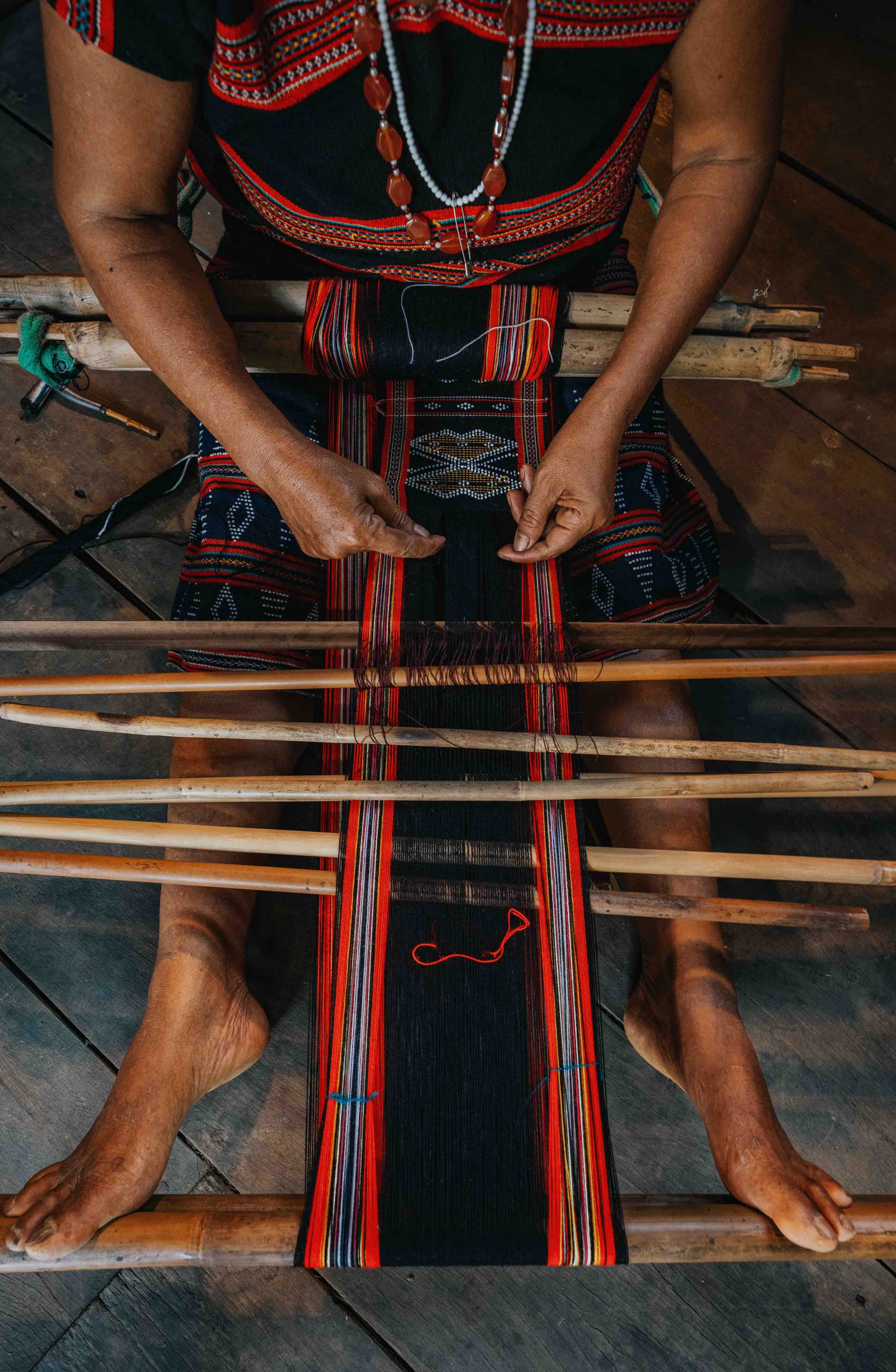 Deng fabric is created on ancient looms made from simple materials like wood and bamboo. While industrial fibers and plastic beads are used today, historically, the Ta Oi grew cotton and spun the threads themselves.