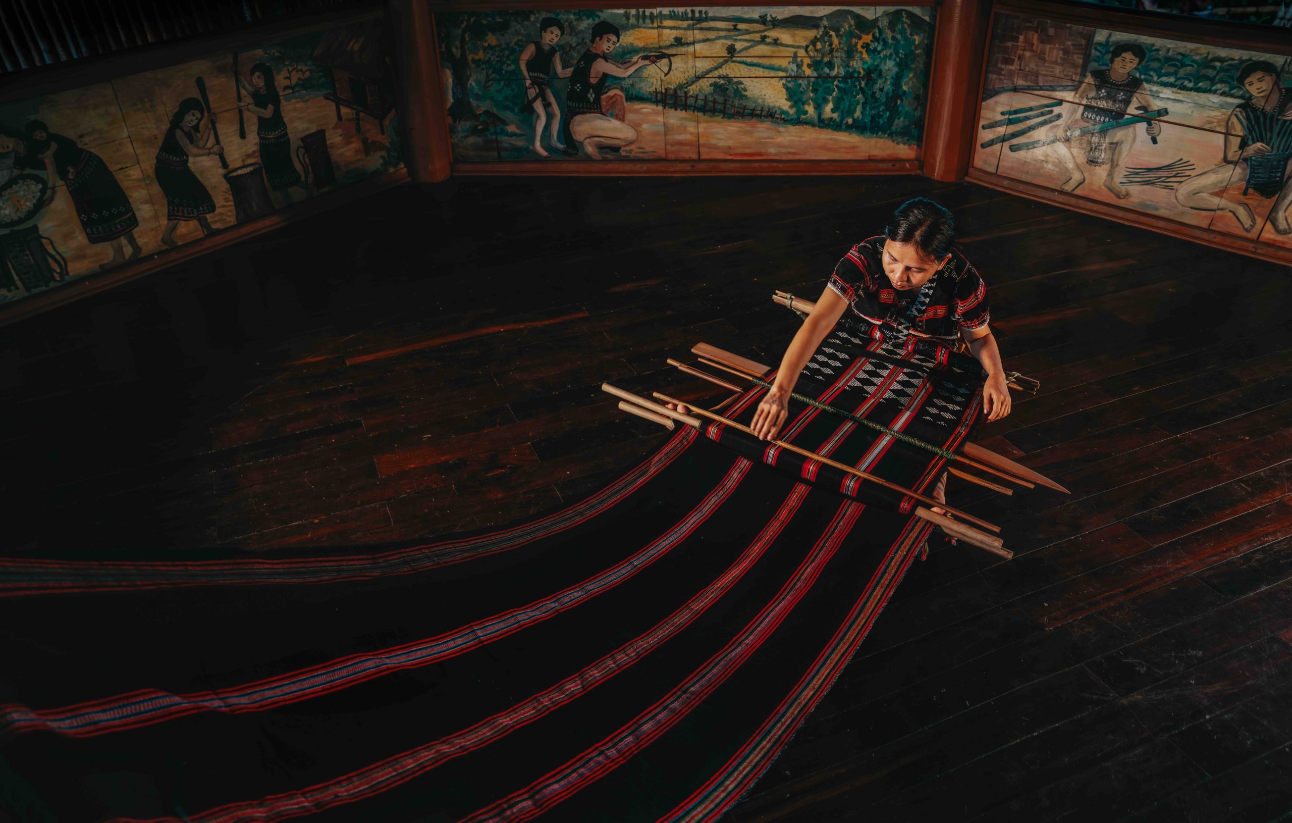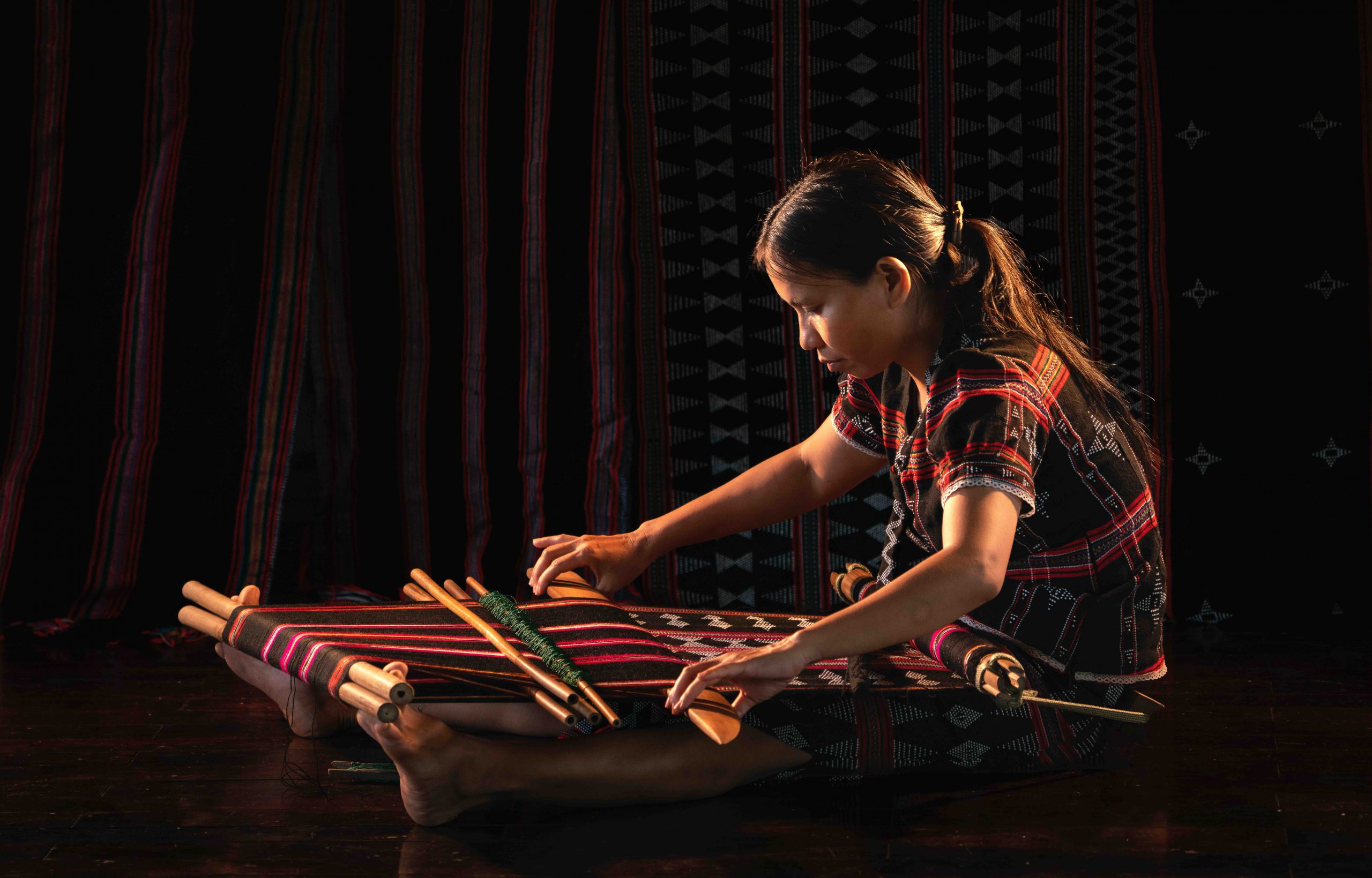 With diligent hands working year-round in fields and gardens, Ta Oi women would set aside their daily tasks each evening to begin their sacred duty by the kitchen fire. They would set up their looms, stretch the threads, and roll up the fabric as they wove. As a result, there is no limit to the length of a strip of Deng fabric.