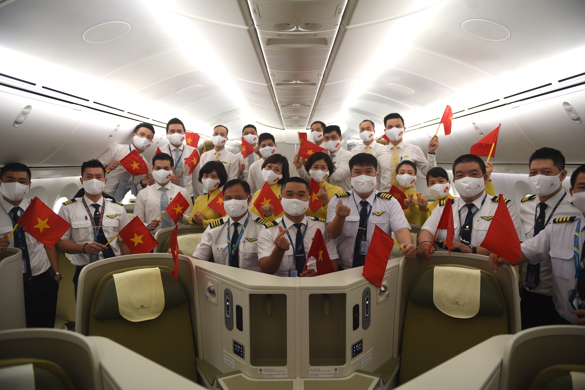 The total flight lasted more than 33 hours throughout its departure from Noi Bai to the US and returned to Van Don. Onround and in-flight service delivery strictly complied with regulations on pandemic prevention and flight safety. The flight crew was equipped with complete medical protective gear, and their communication was restricted during the service delivery. Passengers went through pre-boarding temperature screening and were required to wear face masks for the entirety of the flight. After landing in Van Don, the passengers were taken to centralized quarantine areas per the regulations while the entire aircraft, from the cockpit to the passenger cabin, was cleaned and disinfected.
