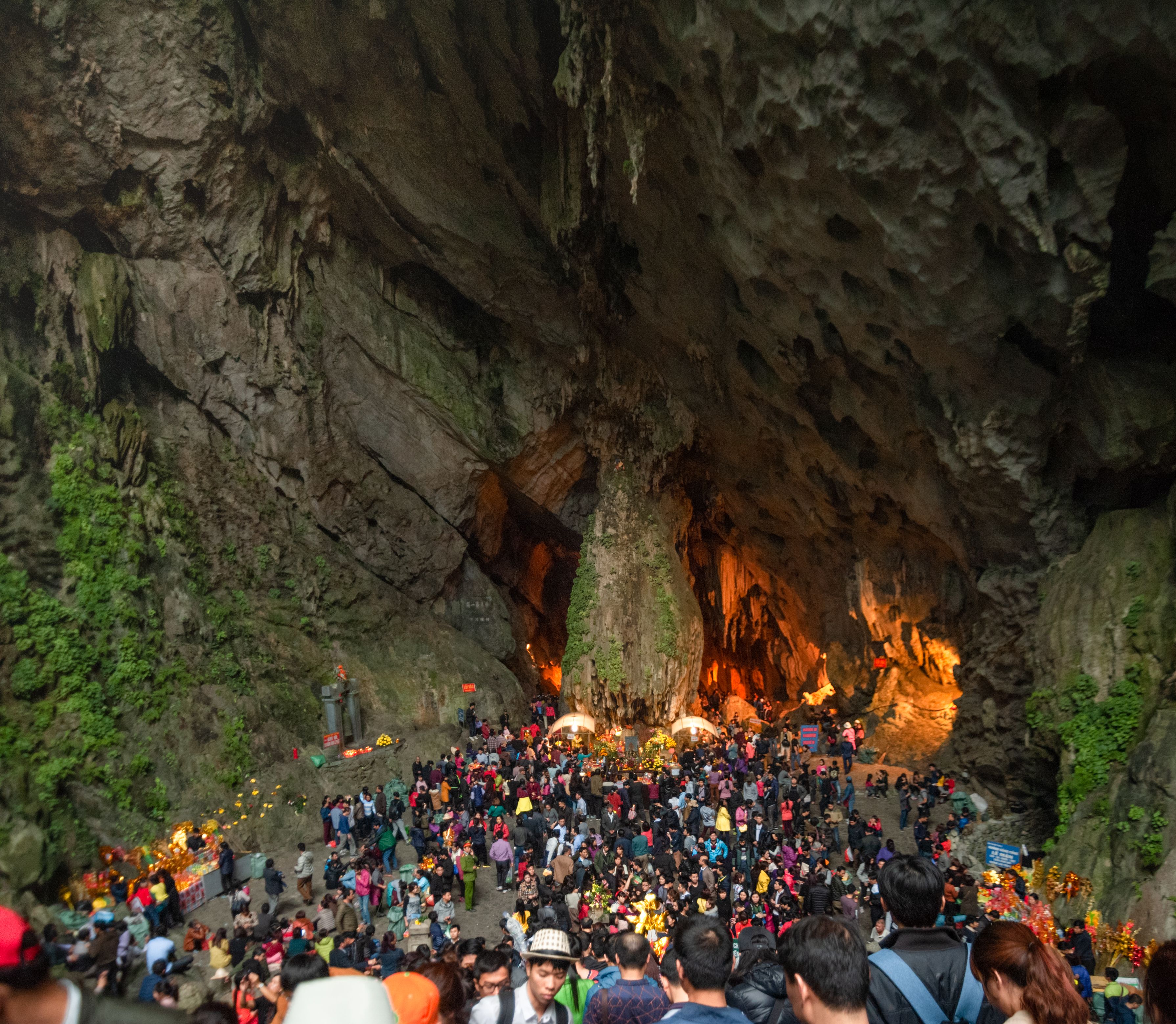 Located in the stunning Huong Son Landmark Complex, Huong Tich Cave is full of sacred legends. Lord Trinh Sam reportedly visited this area in 1770 and granted the cave the title “Nam Thien de nhat dong” (1770), or the “Most Majestic Cave in the South”. Huong Tich Cave resembles the huge jaws of a dragon. Inside the cave, visitors will find a blue stone sculpture of Padmapani Bodhisattva carved in the Tay Son era (1793). There are tens of thousands of large illuminated stalactites in bizarre shapes, including: Bau sua Me (Mother’s Breast), Dun Gao (Pile of Rice), Dun Tien (Pile of Cash), and so on. On the cave’s ceiling, nine dragon-like stalactites hang facing a spherical stalagmite on the cavern’s floor in a formation called “Nine dragons battle for the pearl”.