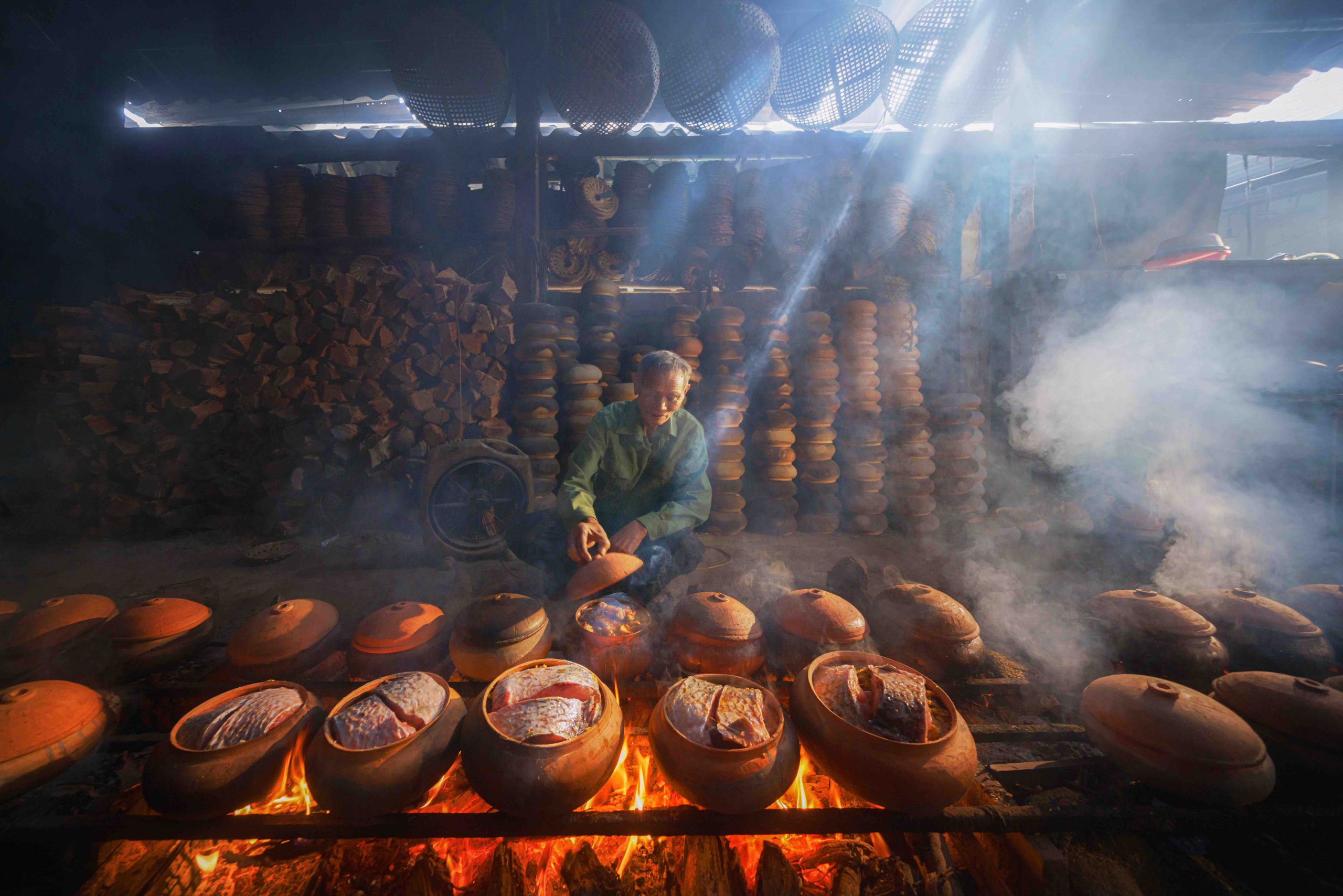 The fish is carefully marinated before being placed in a clay pot and cooked over a charcoal fire made from longan wood. The cook must closely monitor the stove to maintain a stable temperature and time the addition of water to ensure the pot does not run dry. After simmering for 8 to 12 hours, the braised fish develops a fragrant aroma, firm texture, and an appealing dark brown color. Today, Vu Dai braised fish is not only a local specialty served to guests within the village but has also gained popularity in many regions, becoming a cherished gift that carries the essence of home.