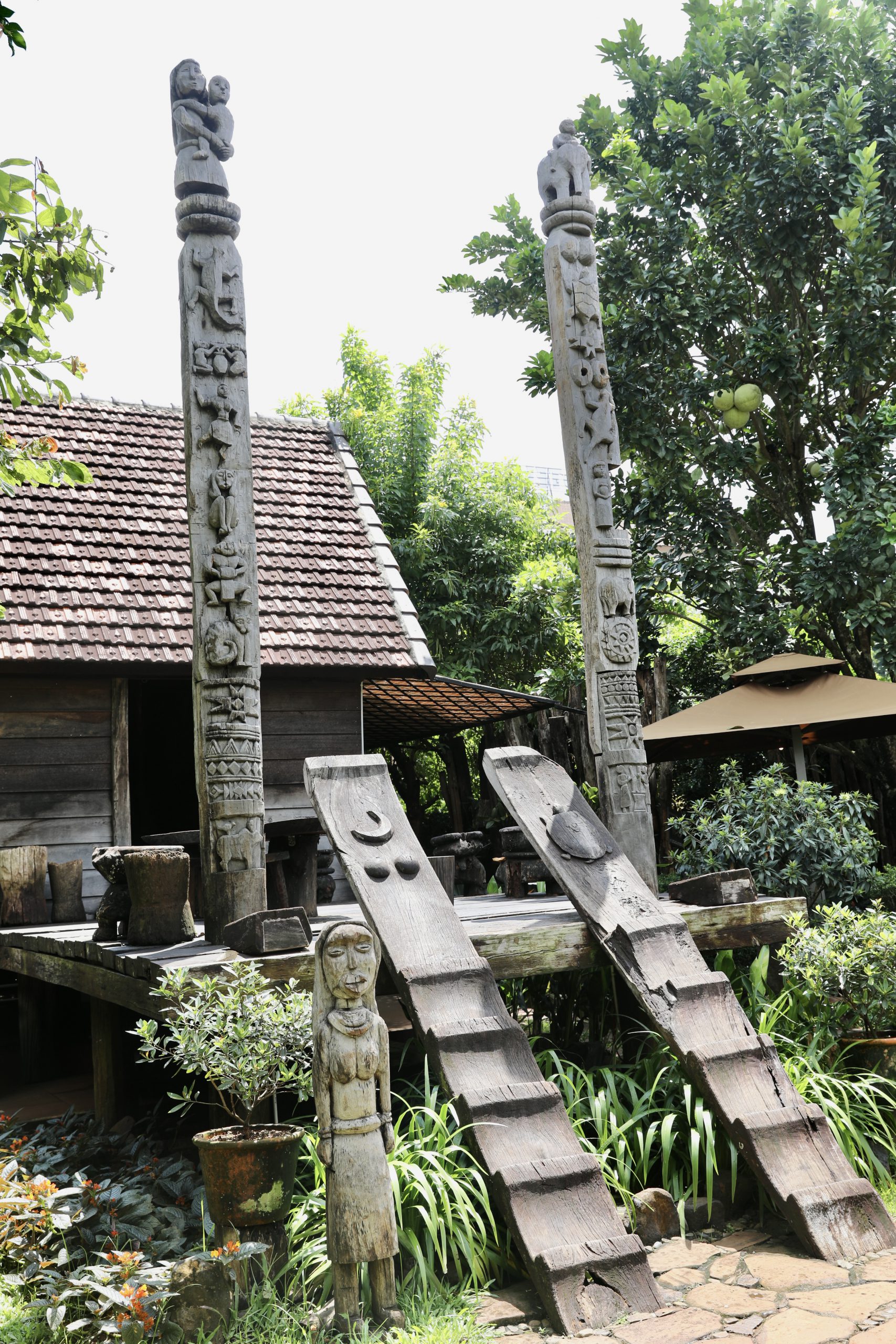“There is nothing new in this space,” said Ms.H’len, pointing from a chandelier made from a collection of large and small kaphas stained by time to the mortar traditionally used to husk rice, but now repurposed as a plant pot.. A special feature of the long E De stilt house, mimicking the architecture of a boat, reminds descendants of the E De people’s origins as seafaring migrants. The staircase at the northern end of the house is carved with the full, round breasts of a woman and next to it is a smaller staircase for men.