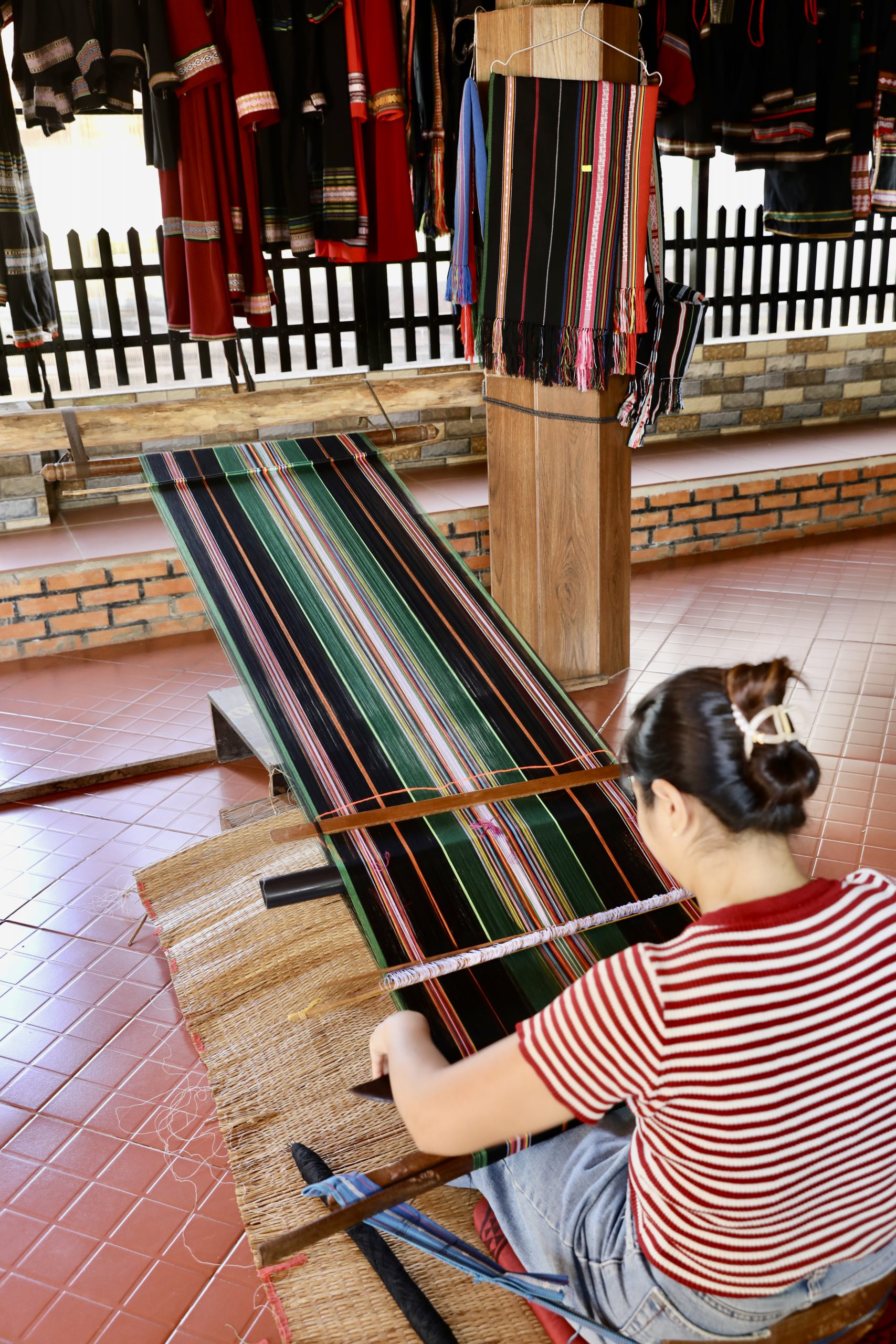 Not far from Arul House is the home of Mr. Ama Dit. At 65 years old, his family was among those who moved to Ako D’hong in 1969 and still preserves the traditional brocade weaving craft of the E De people. Although it’s no longer the main source of the family’s income, their brocade tablecloths and bags still remind Ako D’hong of this traditional craft.