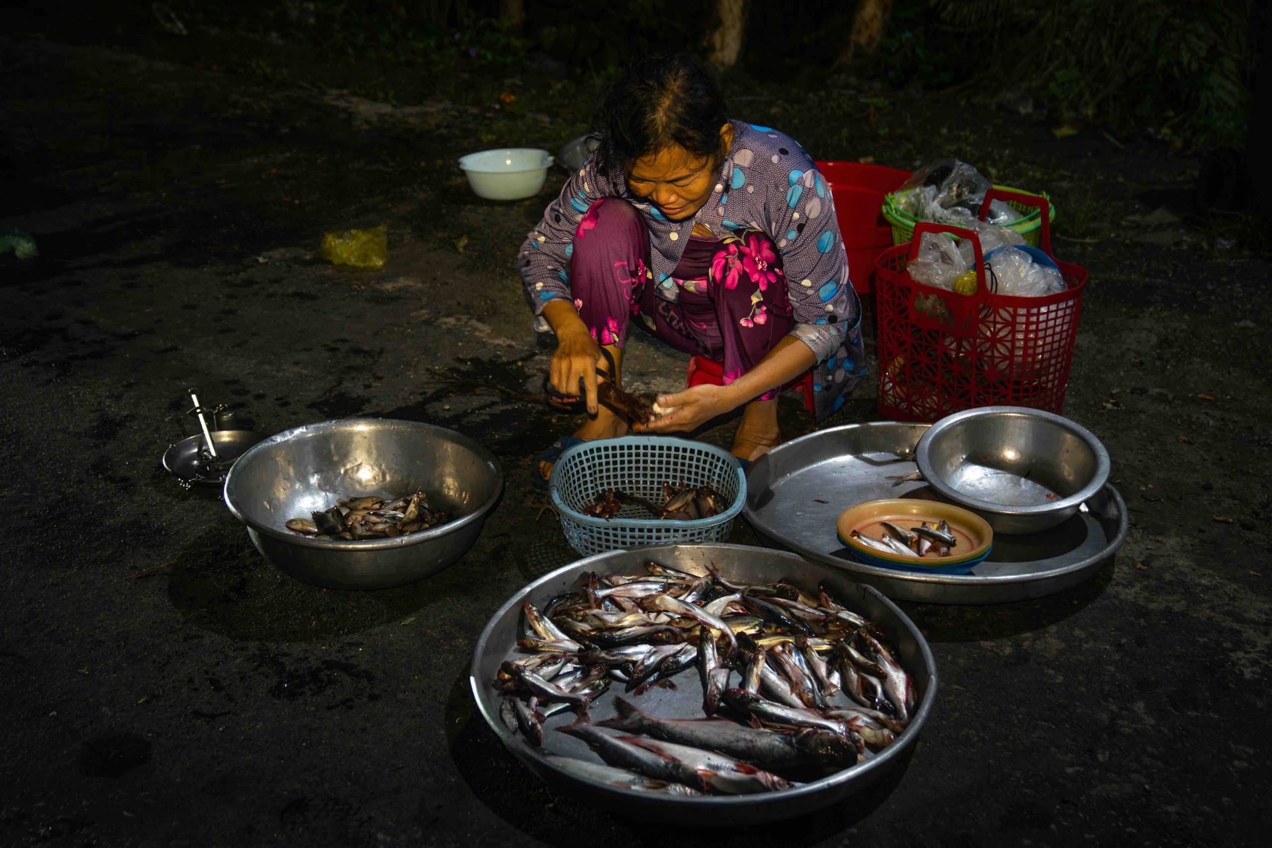After dark, fishermen cast nets, set traps, and fish in the canals of Tha La and Vinh Te, near the Cambodian border. Around 3 a.m., as the wind rustles through the quiet night, the sound of approaching boats breaks the stillness. Vendors gather to inspect the fishermen’s catch and start trading, bringing the market to life. The fishermen bring their bounty ashore along Tha La Canal, selling and weighing it on the spot. To ward off mosquitoes, locals burn dried coconut leaves, filling the air with smoke. Though streetlights on Tha La Bridge offer some illumination, they are insufficient, so vendors wear headlamps while buyers use flashlights, casting a flickering, ghostly glow in the darkness.