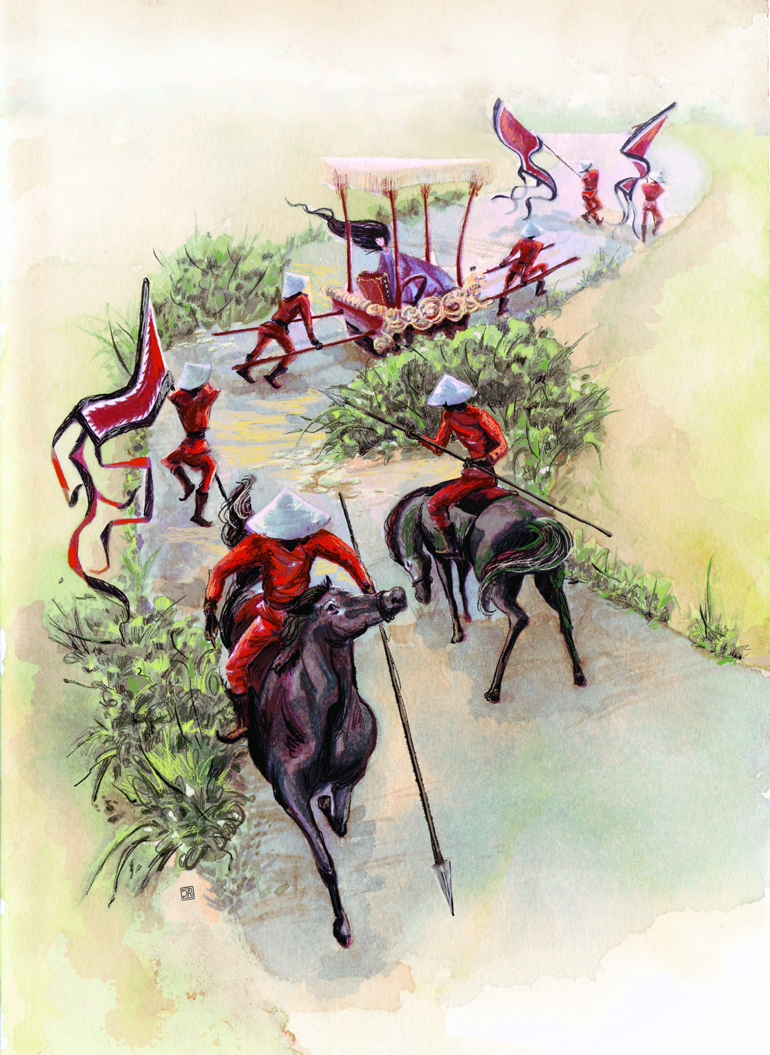 When they reached the district where the young farmer and his wife lived, they held a three-day festival. Hearing the soldiers’ lies, the young man came forward to reclaim his wife’s portrait. The soldiers caught him and forced him to take them to his house. There, they captured his wife and took her away in a palanquin.