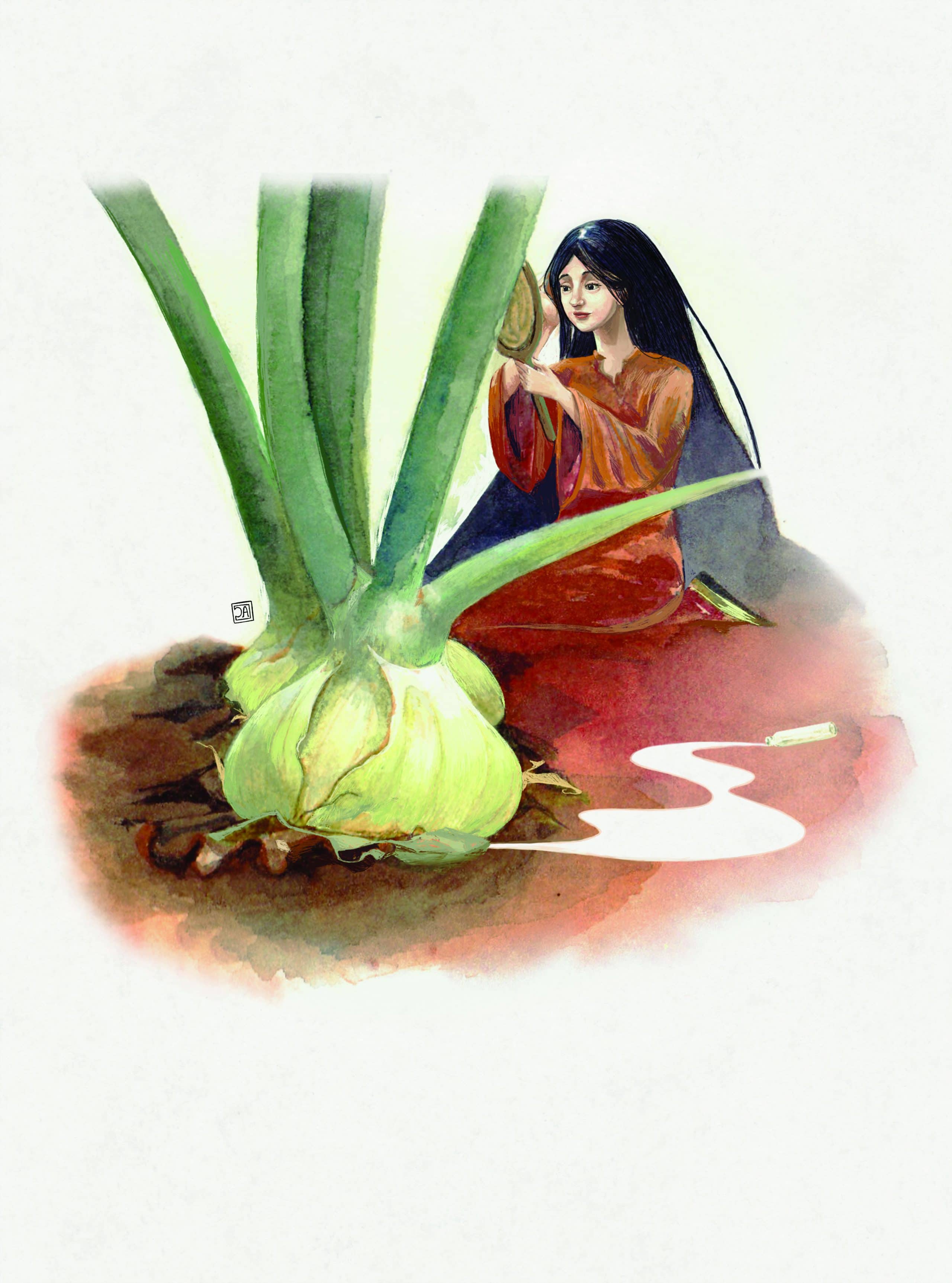 After his wife was taken away, the young man fell into despair. Hearing of the king’s reward, the husband knew that his wife had been taken to the palace. He was determined to retrieve her. Before leaving, he uprooted some scallions, tied them into a big bunch and carried them by his side. Outside the citadel he cried: