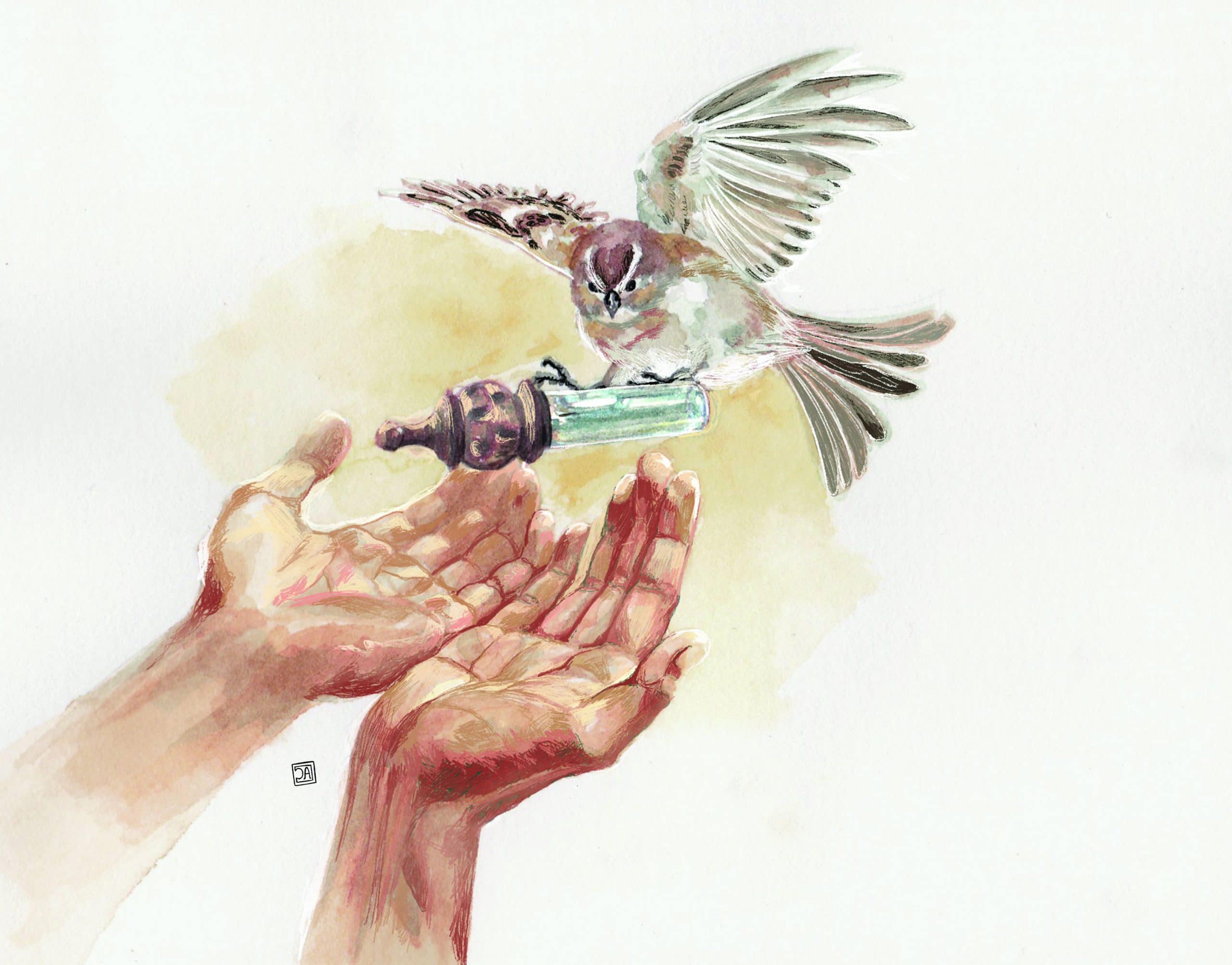 Some time later, the sparrow returned with a tiny pot. It set the pot near the young man and said: “This holds magic water that can rejuvenate mortals and make everything grow. It can be found nowhere else.” The sparrow then flew away.