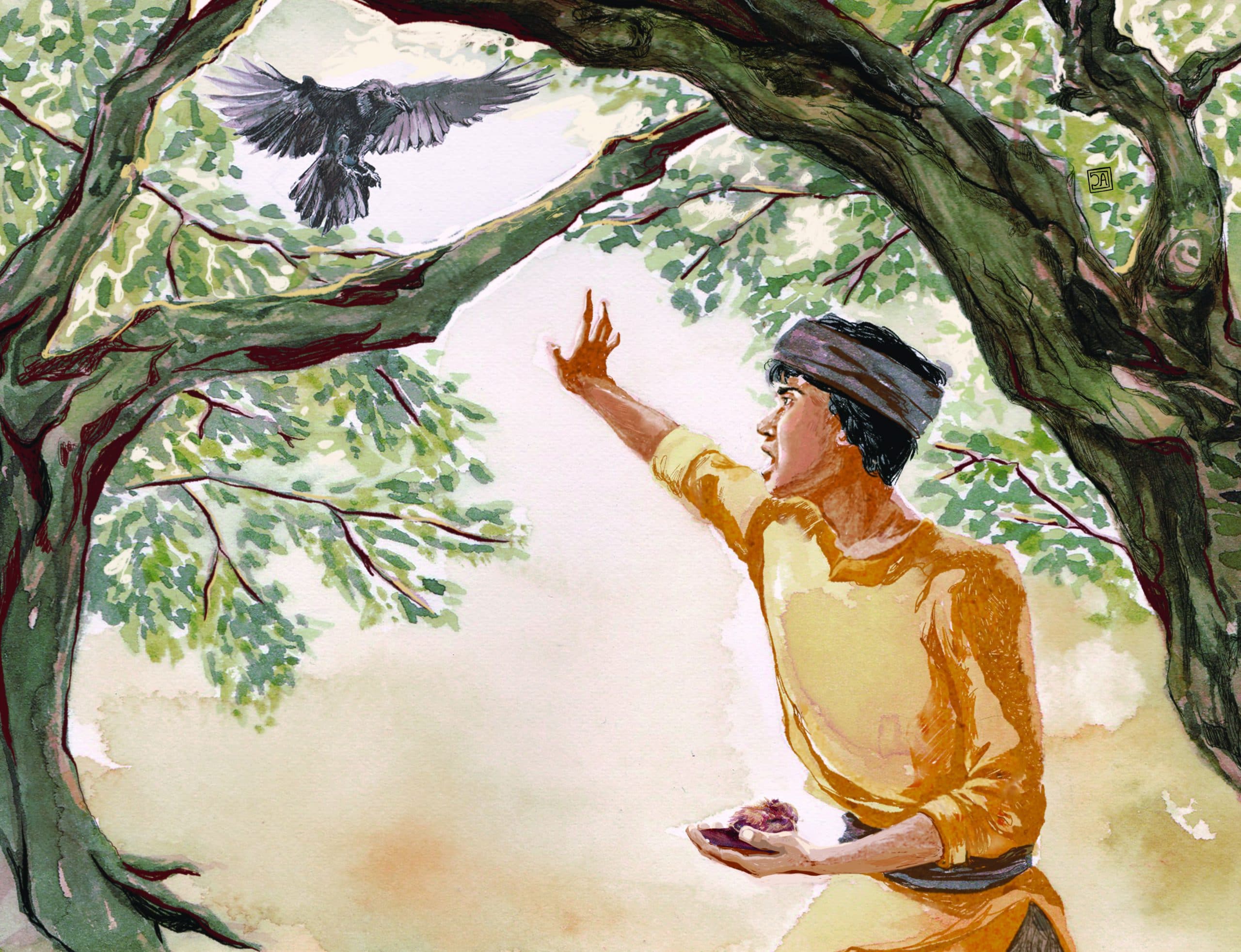 Feeling sorry for the small and helpless sparrow, he picked up a rock and threw it at the raven. The wounded raven flew off in a fury, squawking that it would get revenge upon the farmer. The farm hand rushed to help the dying sparrow, holding it in his warm hands. In the blink of an eye, the sparrow came back to life. Before flying away, it thanked the young man and told him to expect a gift.