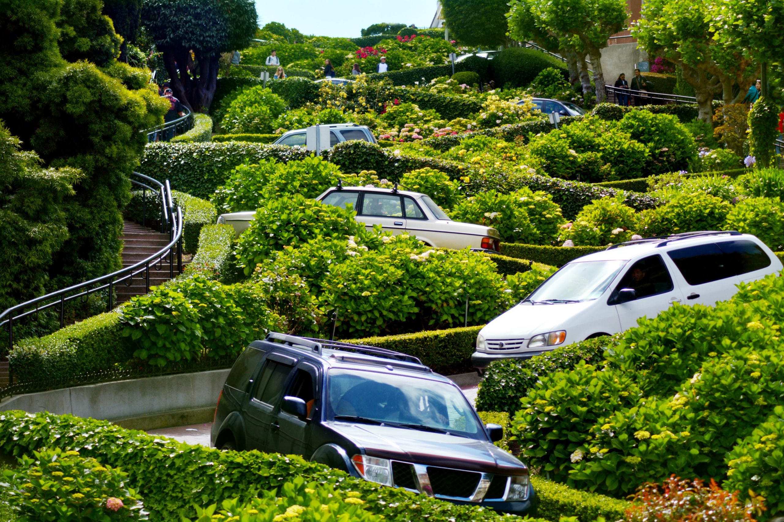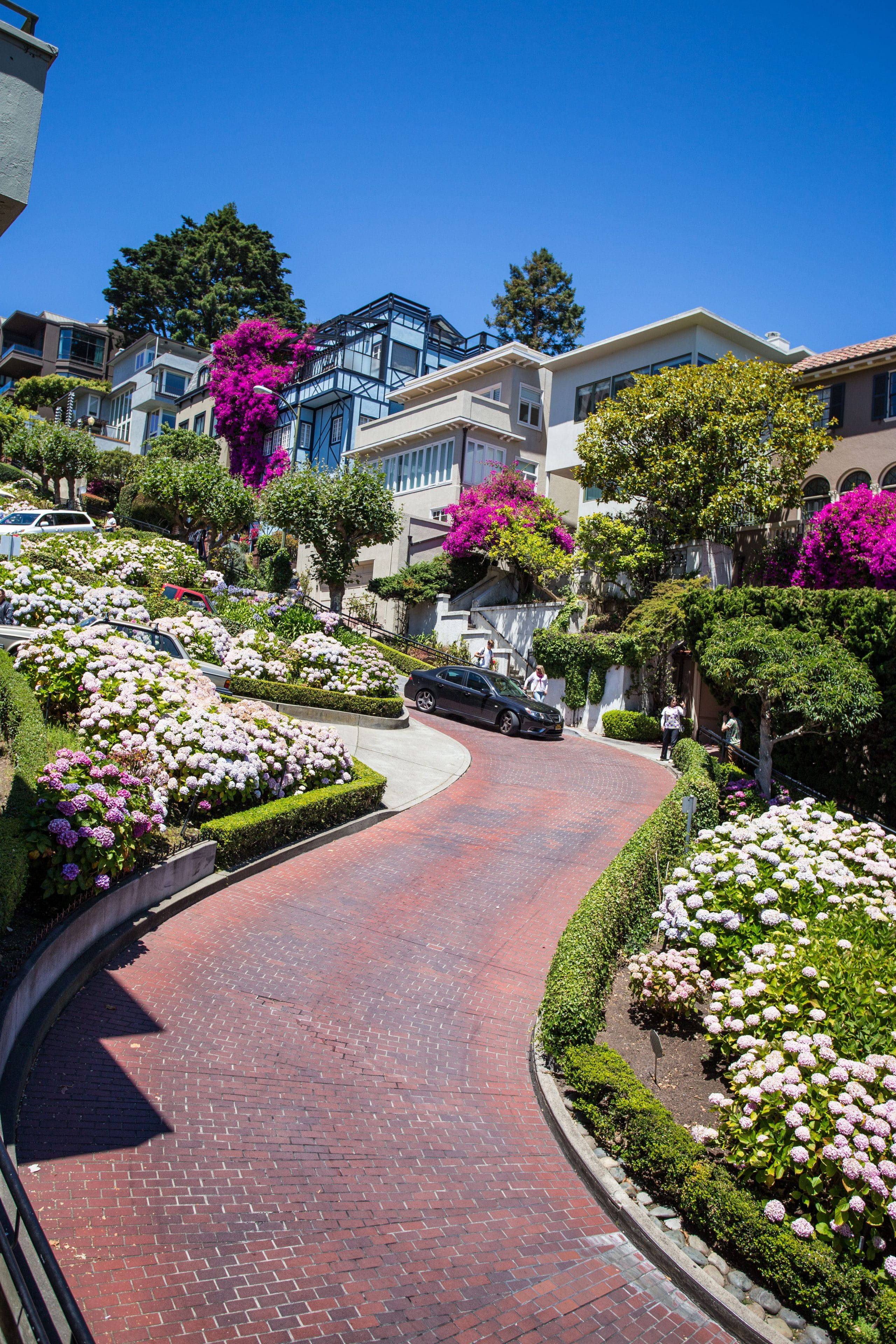 Visitors are often stunned by this street, wondering why it’s so crooked. The answer I got form the elderly lady about “safety” is not wrong. Hairpin turns were made to reduce the hill’s natural 27% grade, making it easier for vehicles to travel. This unique road is used by one-way traffic descending from Russian Hill.