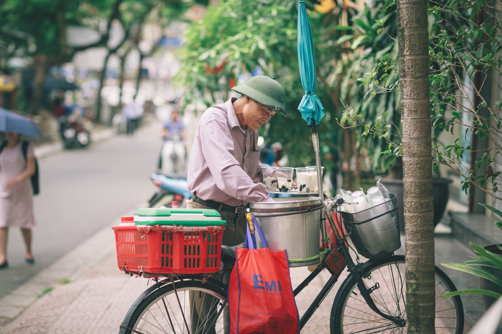 Đôi quang gánh đậu hũ, một bên là nồi đậu hũ, một bên là bếp lò giữ cho nồi nước đường luôn sôi lăn tăn. Tô, muỗng, thau nước cũng được các cô chất khéo trên đôi quang gánh. Mỗi khi có khách gọi, người bán nở nụ cười tươi rói, thả đôi quang gánh dừng bên vệ đường, bày cái ghế nhựa con con cho khách ngồi.