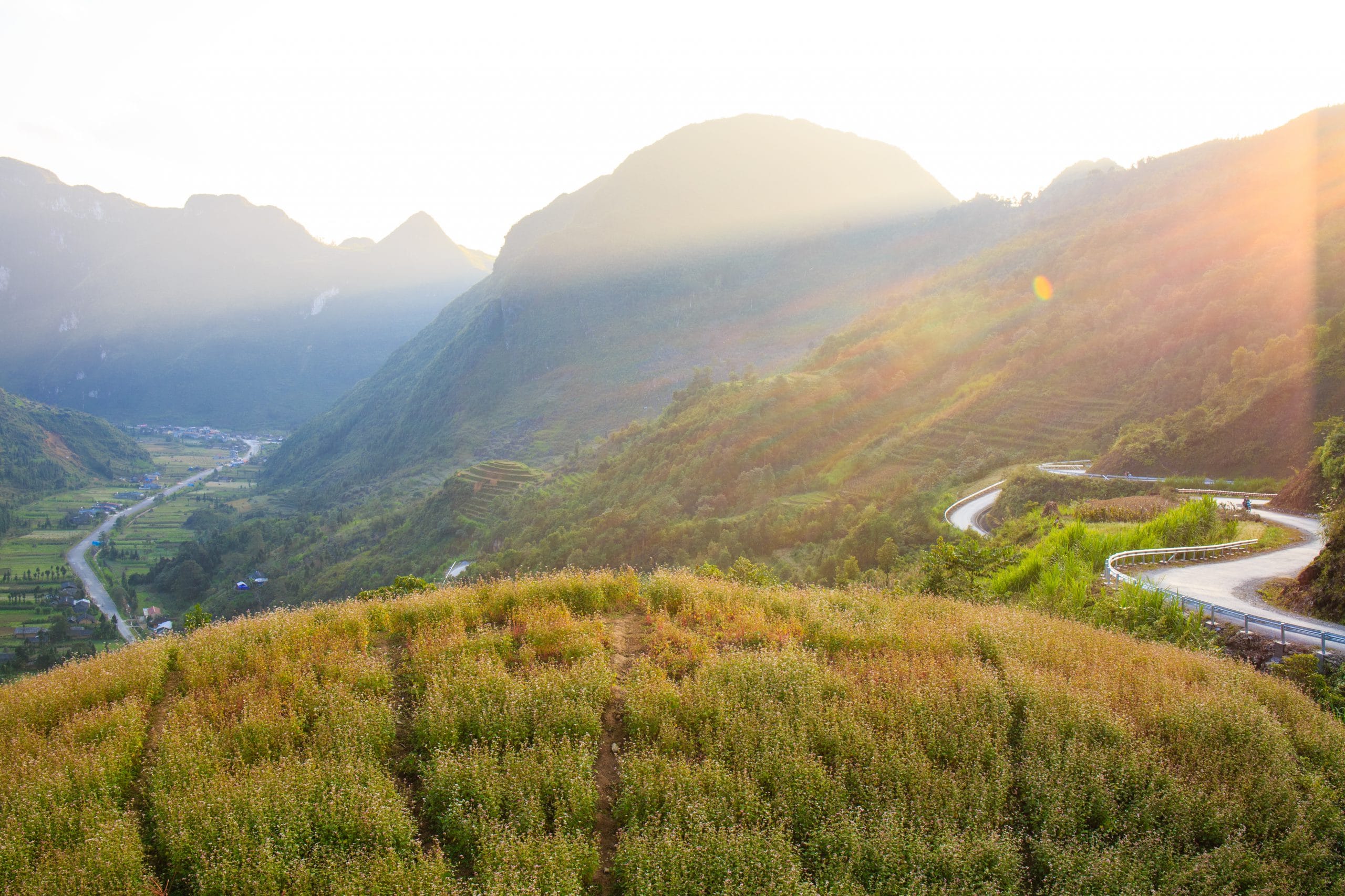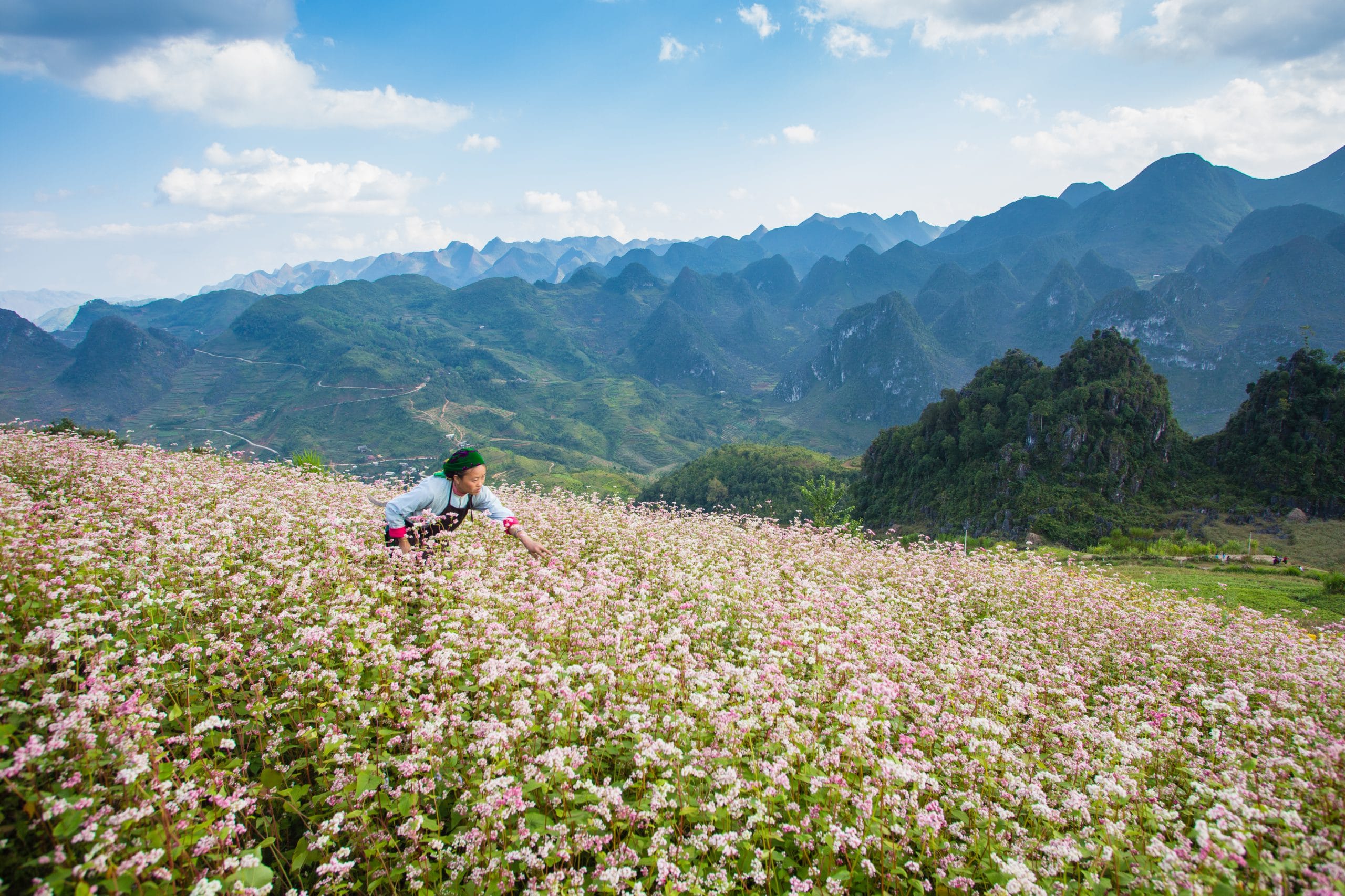 Xanh mướt tới tận mùa thu, đồi núi bắt đầu thay áo mới, những thửa ruộng bậc thang vàng rực, các nhiếp ảnh gia lại háo hức chạy tới chạy lui để tìm cho được những khoảnh ruộng bậc thang còn xanh làm điểm nhấn trong bức tranh mùa vàng. Lúa đã đầy bồ, ngô đã dăng hàng ngoài hiên, trên gác bếp. Khi cơn gió se se lạnh thổi về, cao nguyên đá xám ngắt, tĩnh lặng nín thở chờ một hơi gió nữa thôi là hàng ngàn, hàng vạn nụ hoa tam giác mạch bừng nở, những bông hoa bé xíu như những hạt thời gian chuyển dần từ màu xanh lục, trắng, tím, hồng, tím đậm. Cúi thấp một tí thôi, để những bông hoa nhỏ ngang tầm mắt, bạn sẽ thấy cánh đồng hoa như rộng ra, ngút ngàn trải dài trên nền núi xanh biếc.