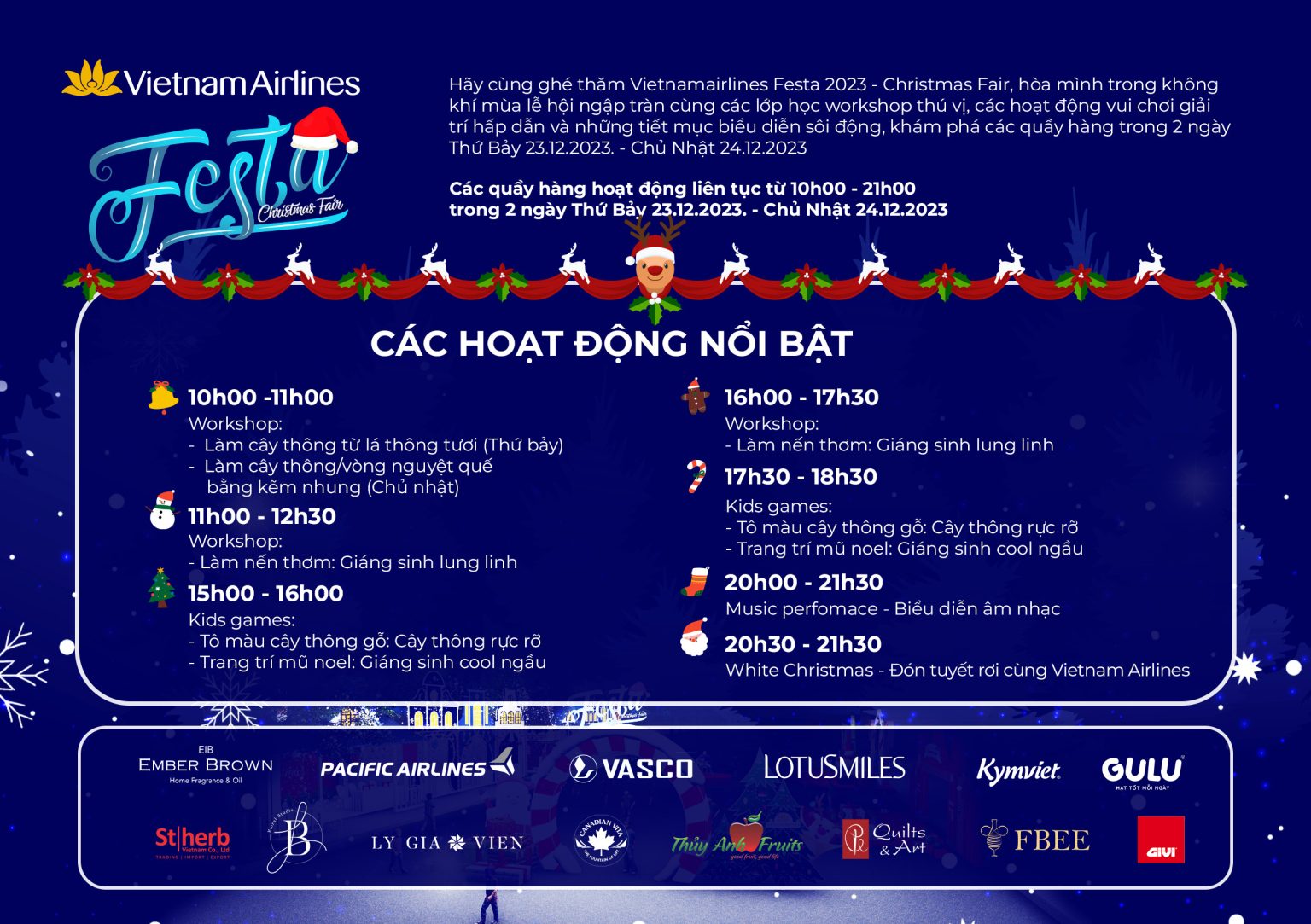 Từ 09h30 – 21h00, ngày 23-24/12 tại Phố đi bộ Hồ Gươm, Vietnam Airlines sẽ tổ chức Hội chợ Giáng sinh mang tên: Vietnam Airlines Festa – Christmas Fair. Ở đây bạn có thể tham gia các chương trình Workshop độc đáo như làm cây thông từ lá thông tươi, tạo vòng nguyệt quế hay làm nến thơm (số lượng có hạn) và không thể thiếu những hoạt động khuyến mãi, ẩm thực hấp dẫn.