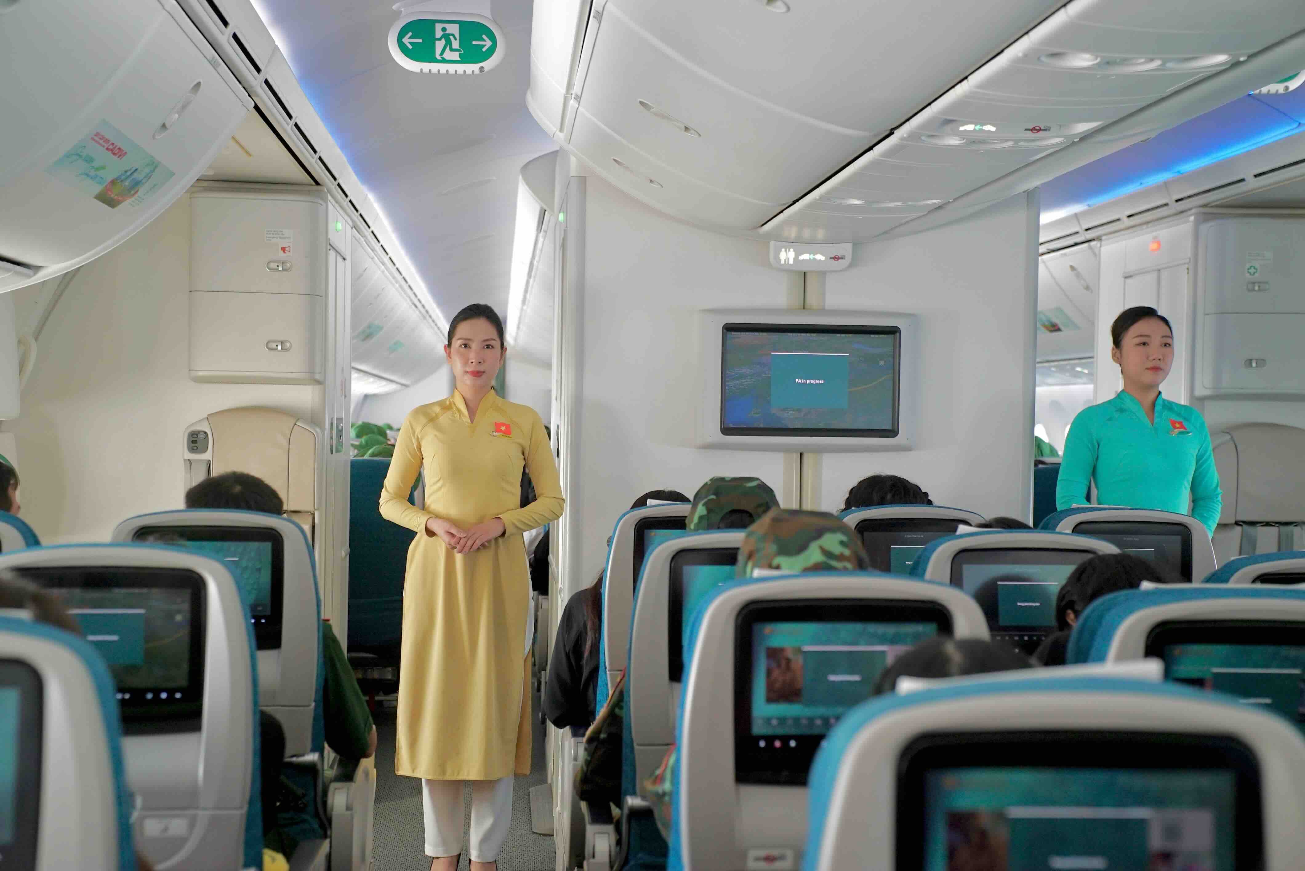 Trên chuyến bay, các tiếp viên của Vietnam Airlines cài huy hiệu cờ đỏ sao vàng trên ngực áo, mang theo sắc màu Tổ quốc trong không gian khoang bay. Hình ảnh ấy hòa chung vào không khí trang trọng của hành trình, như một lời cảm ơn gửi đến các chiến sĩ đã hoàn thành xuất sắc nhiệm vụ và trở về trong niềm tự hào.