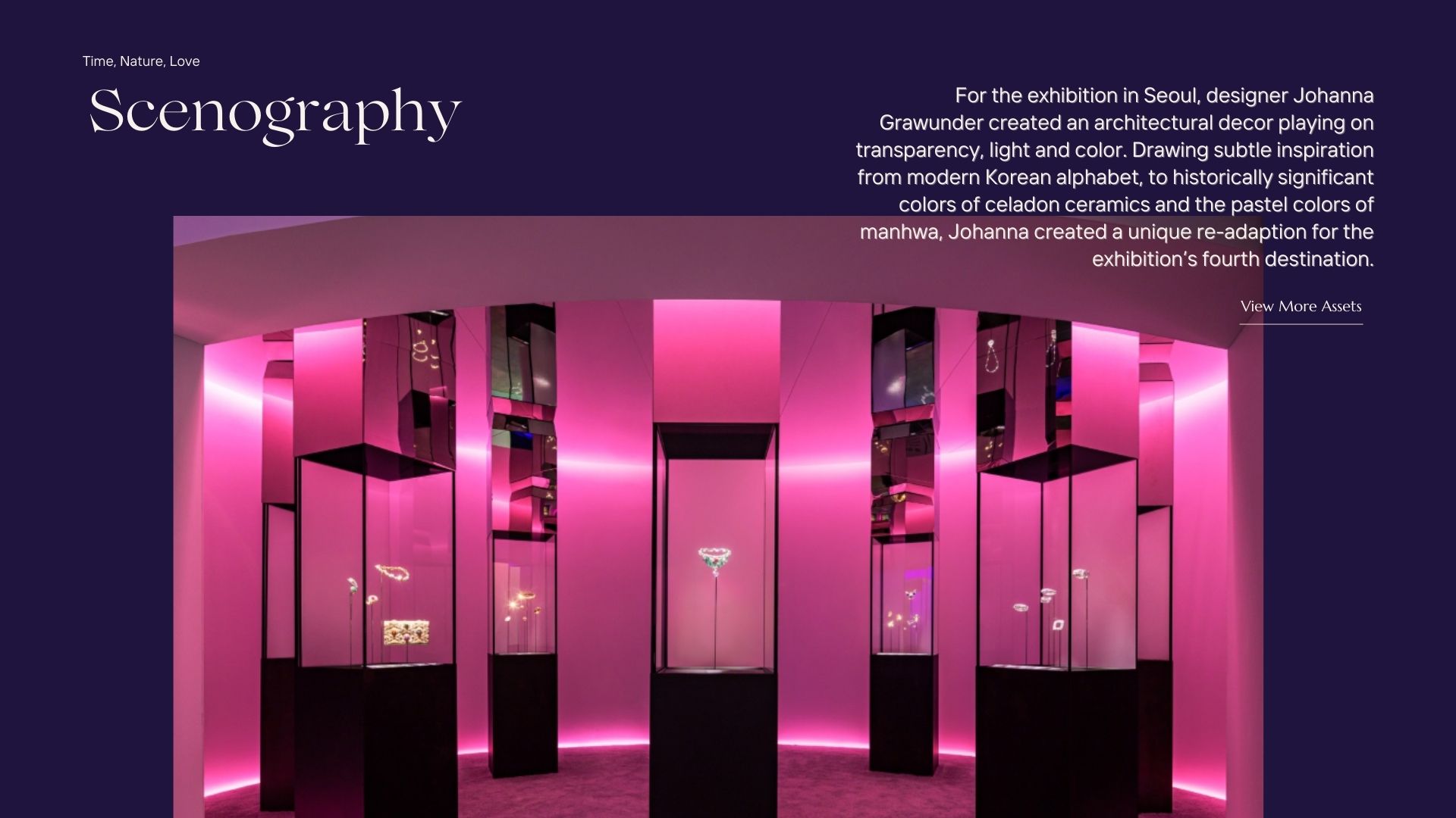 Các không gian được thiết kế làm nổi bật sự giao thoa của ngành kim hoàn với nhiều bộ môn nghệ thuật khác như thời trang, khiêu vũ và kiến trúc.