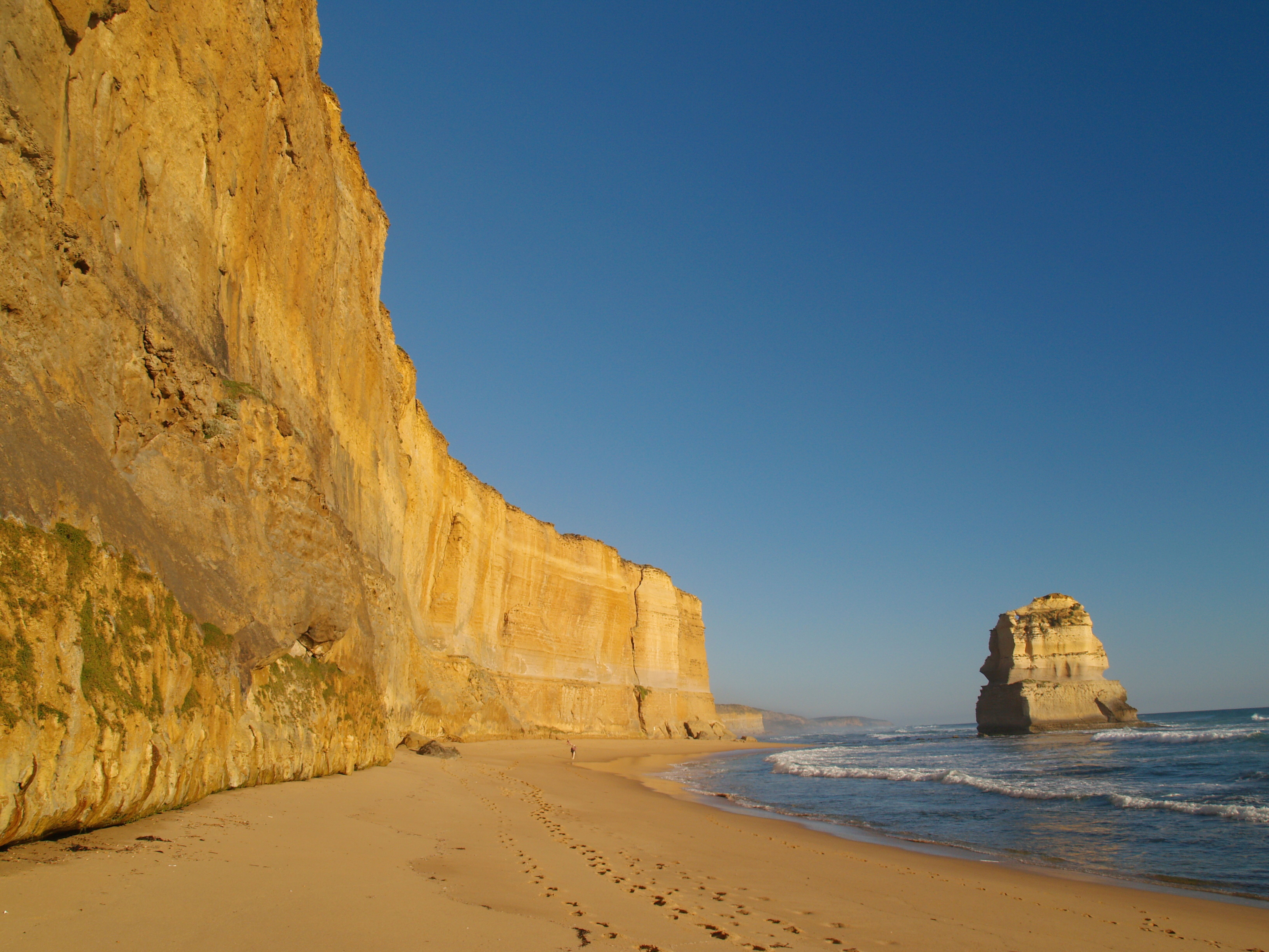 Không thể kìm được sự trầm trồ trước những tuyệt tác của tạo hóa, chúng tôi đi theo những bậc thang Gibson Steps xuống bãi cát phía dưới để được hòa mình với sóng biển, thay vì chỉ ngắm nhìn khung cảnh từ trên cao. Nước biển vào những ngày đầu tháng 7 lạnh thấu, cùng những con sóng từ ngoài khơi không ngừng ập vào bờ trắng xóa và ập vào cả những vách đá, chỉ trực bào mòn từng lớp đá vôi sau mỗi nhịp. Đó cũng là cách mà các cột đá được hình thành từ cách đây 20 triệu năm trước, khi sóng và gió biển tạo ra các hang động trong vách đá ở lục địa rồi trở thành các cổng vòm, trước khi đá sụt thành cột đá như ngày nay. Có đứng đây giữa những vách đá mới thấy con người thật nhỏ bé trước thiên nhiên, trước những “vị Tông đồ” đang đứng hiên ngang phía ngoài kia.