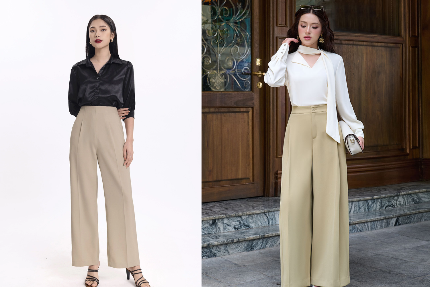Hãy bắt đầu bằng chiếc quần lụa ống suông – biểu tượng của sự mềm mại và duyên dáng. Khi kết hợp với áo dệt kim mỏng cổ tròn hoặc cổ thuyền, bạn sẽ có một vẻ ngoài vừa chỉn chu, vừa nhẹ nhàng. Thêm một đôi guốc da sục nhỏ, một túi xách tay vintage và đôi hoa tai ngọc trai, bạn sẽ thấy mình như bước ra từ những khung hình cũ trên phố Nguyễn Du.