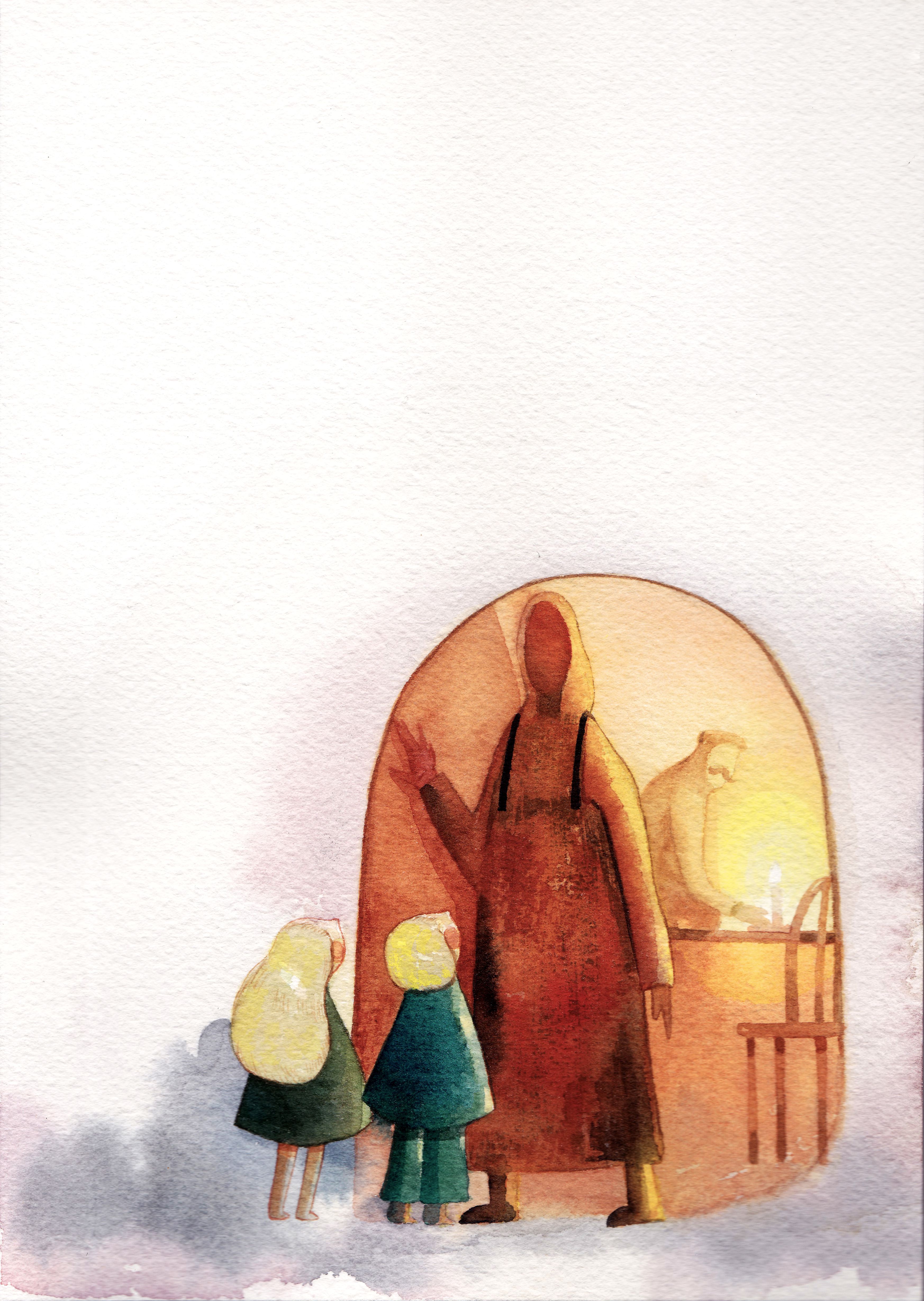 Từ tờ mờ sáng, khi mặt trời chưa mọc, bà mẹ kế đã tới đánh thức hai đứa trẻ: “Lũ trẻ lười biếng này, dậy mau, còn phải vào rừng kiếm củi chứ”. Sau đó bà đưa cho mỗi đứa một mẩu bánh nhỏ xíu và dặn: “Đây là phần ăn cho bữa chiều, giờ mà ăn thì bữa sau chả còn gì đâu”.