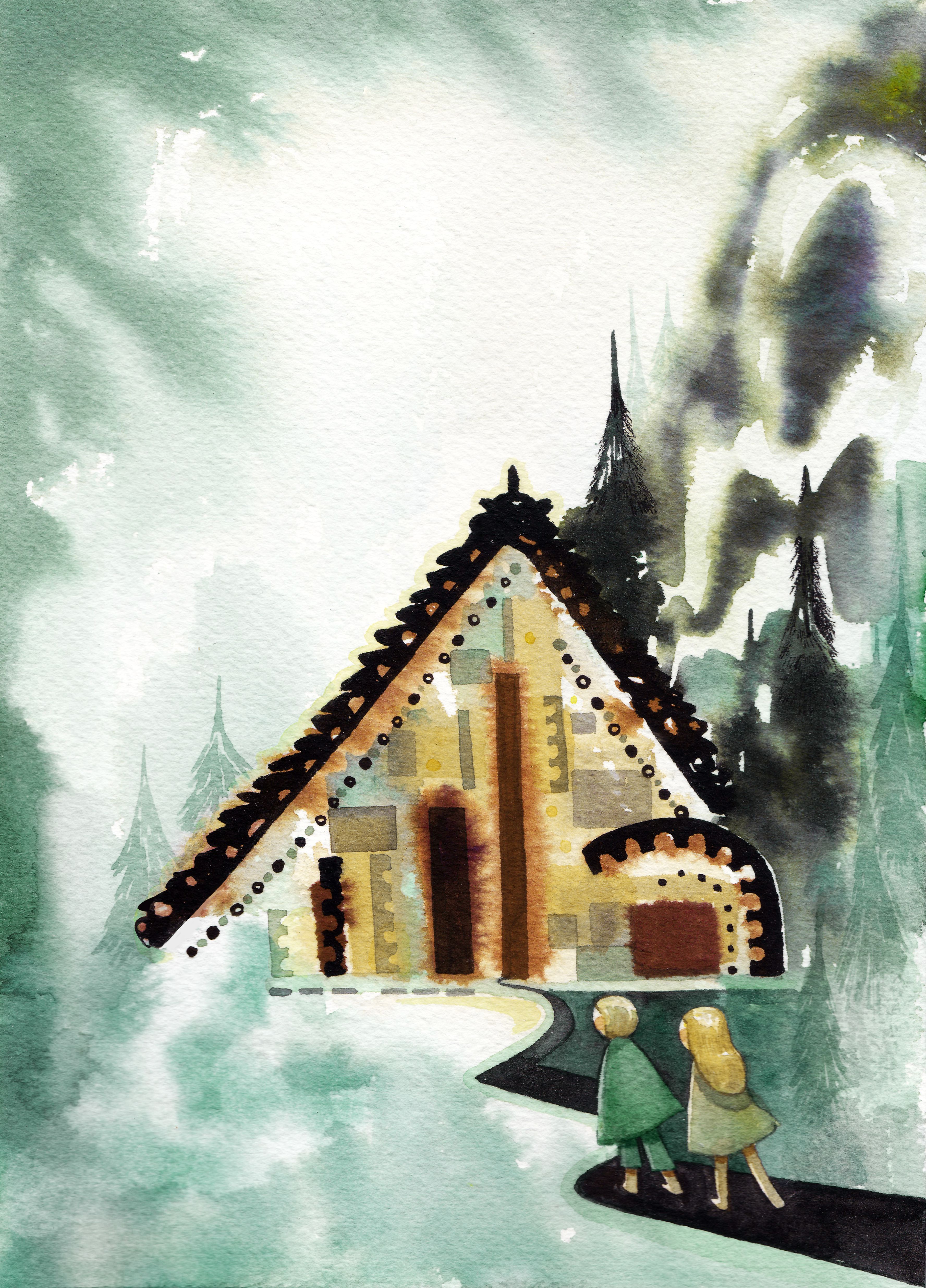 Trăng vừa mọc thì hai đứa đứng dậy đi, nhưng chúng không thấy một vụn bánh nào cả, vì lũ chim đã sà xuống ăn hết. Chúng lang thang trong rừng, bụng đói cồn cào. Hai anh em đi theo một con chim thì thấy một ngôi nhà xây bằng bánh mì, ngói lợp là bánh ngọt, cửa sổ bằng đường kính trắng tinh. Không tin vào mắt mình, chúng mò đến gần hơn. Hansel giơ tay bẻ một mảnh mái nhà để ăn thử xem có ngon không. Và Gretel đứng bên cửa sổ gặm cho đỡ đói. Chợt có tiếng người nói nhẹ nhàng vọng ra: “Ai đang gặm nhà riêng của ta vậy?”. Hai đứa trẻ đồng thanh đáp: “Gió đấy, gió đấy” và chúng tiếp tục ăn. Cửa bỗng mở, một bà mù tay chống nạng bước ra. Bà lão lắc lư đầu và nói: “Trời, có phải lũ trẻ không? Các cháu bị lạc à? Nào vào nhà đi và ở đây với bà”.