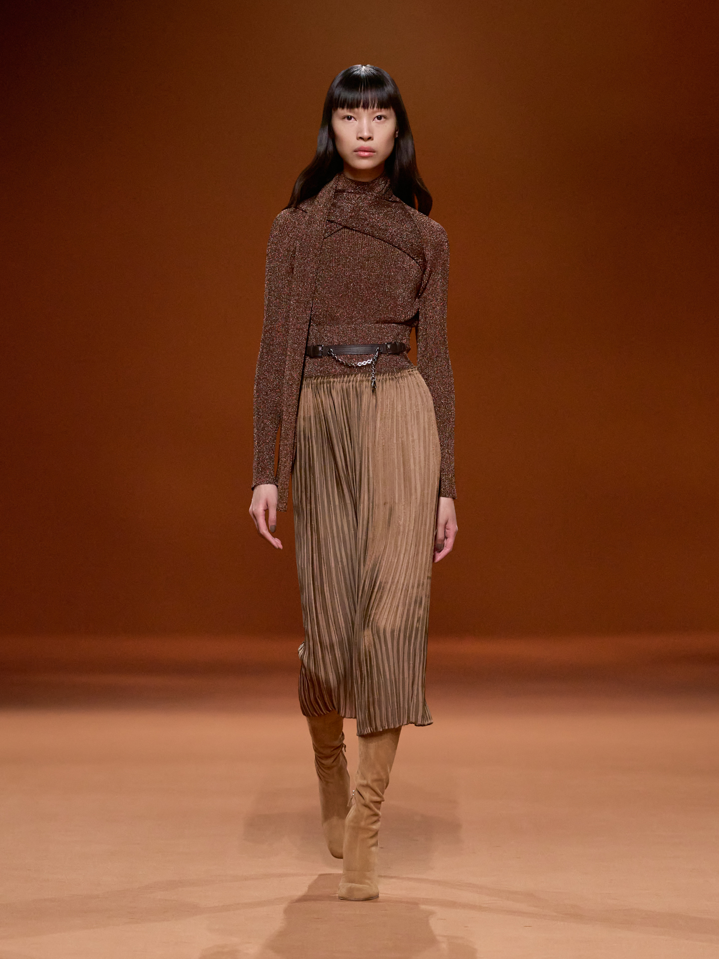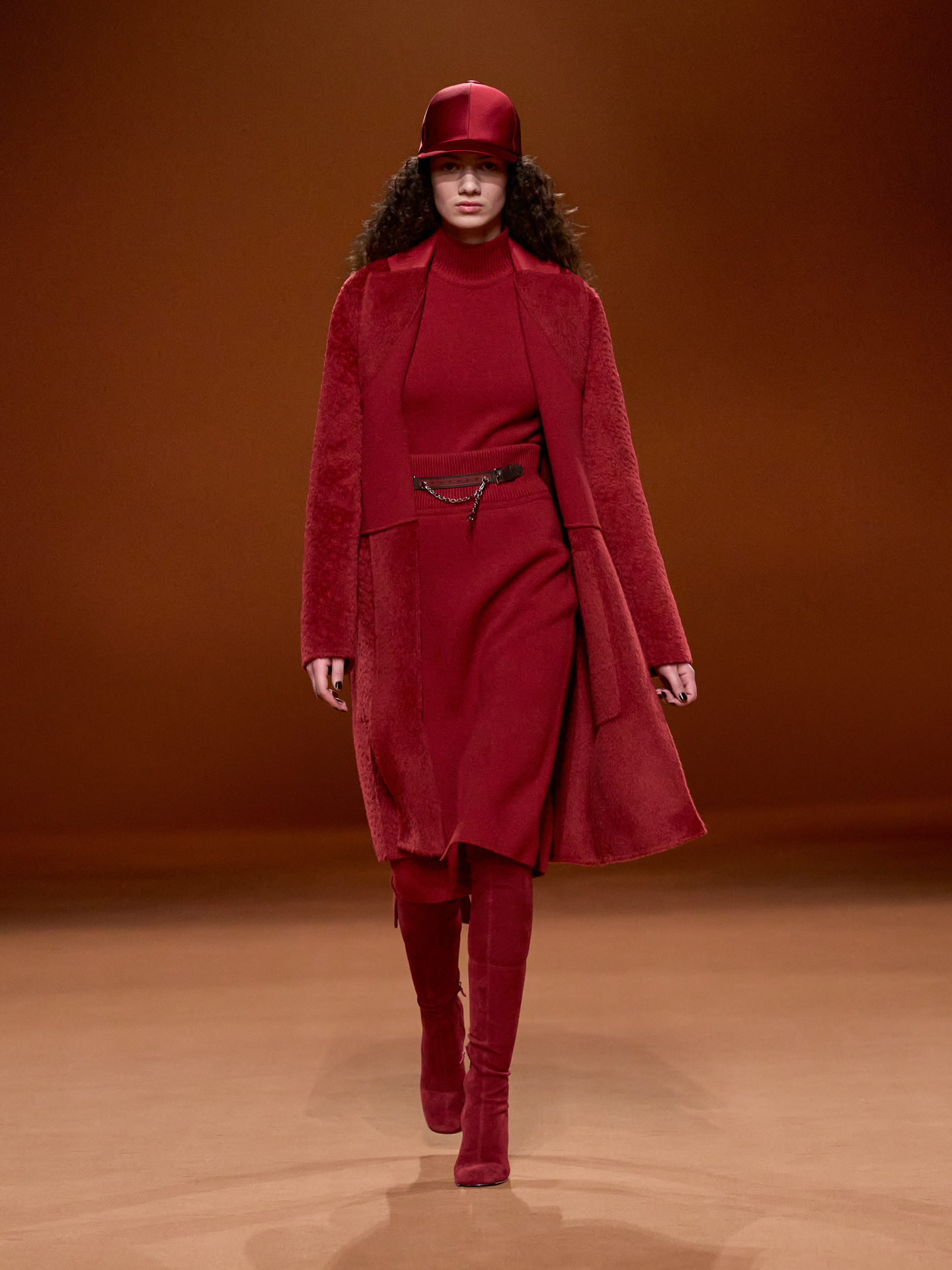 Kín đáo và ấm áp, các thiết kế đơn sắc lần lượt xuất hiện trong bảng màu mùa đông. Người phụ nữ của Hermès mùa này khoác lên mình những sợi dây buộc, những nút thắt từ trong thiên nhiên. Cùng với dây buộc và cài tóc, trang phục trở nên sống động, bồng bềnh và uyển chuyển theo sự mềm mại của những lọn tóc.