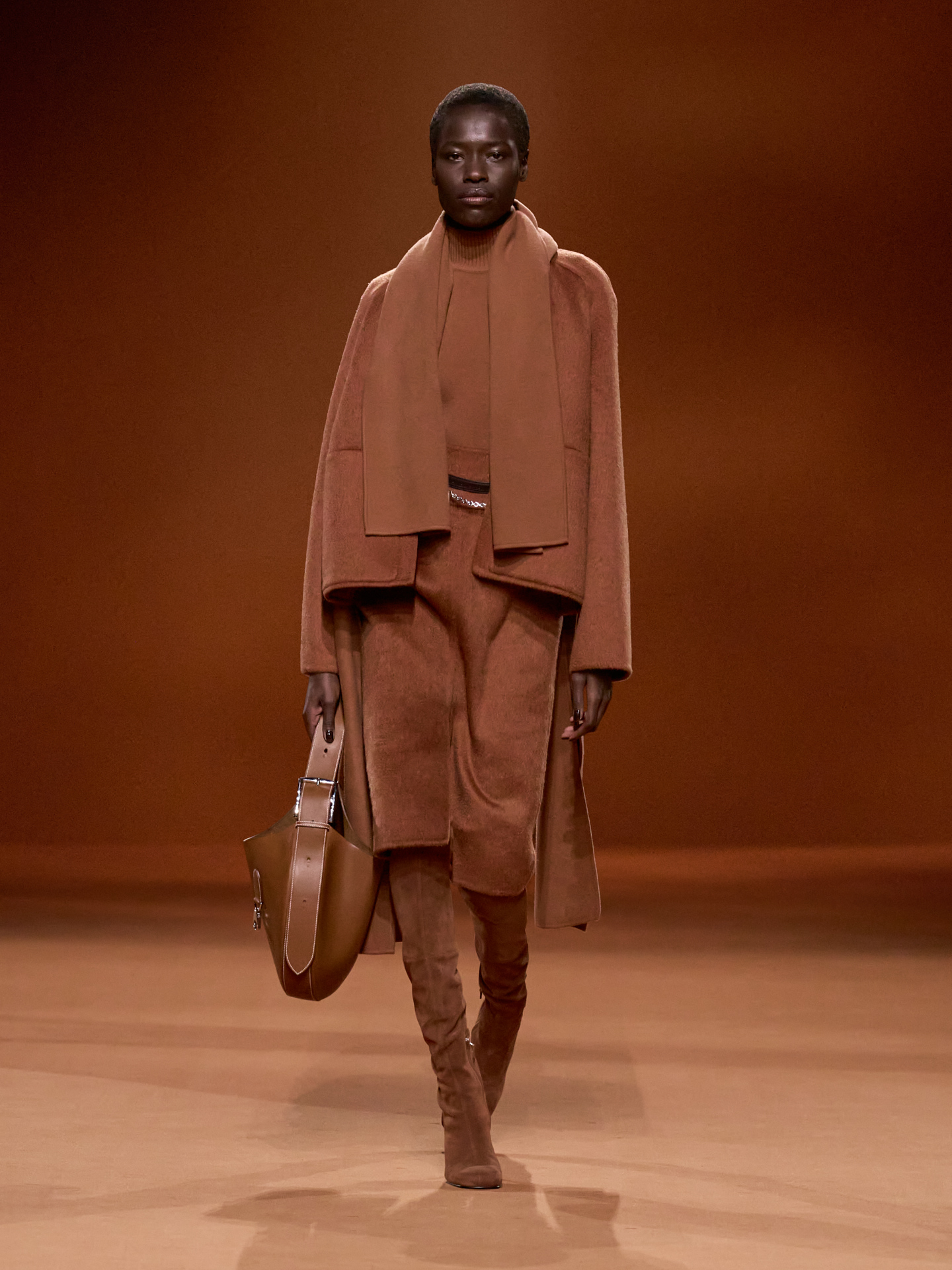 Áo choàng và trang phục dệt kim từ sợi len và lụa bao phủ sàn diễn. BST cũng giới thiệu các dáng áo khoác chần bông và áo khoác có mũ bằng da bê mịn hoặc len và vải nỉ cashmere, áo khoác dài kiểu vải thô bằng vải cashmere hai mặt, áo khoác kéo khóa bằng da cừu sáng bóng.