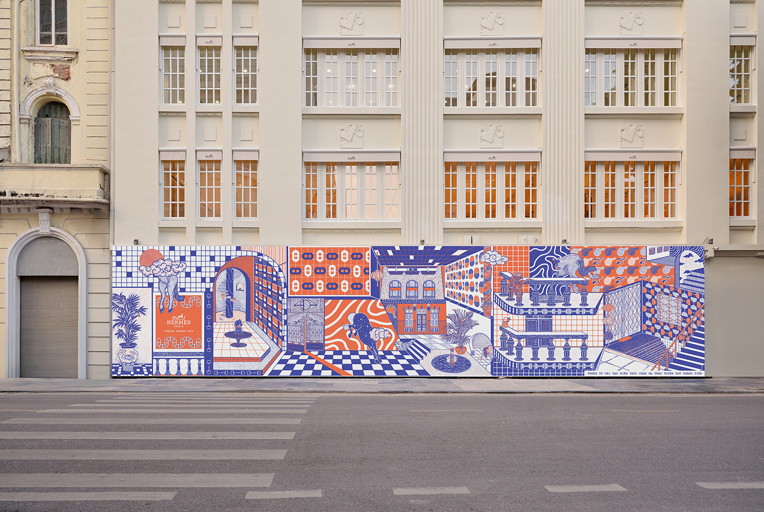 Những ngày này, tín đồ thời trang xa xỉ Việt đang hồi hộp chờ đến ngày chính thức khai trương cửa hàng Hermès mới tại Hà Nội – được khai trương ở số 24 phố Tràng Tiền. Mặt tiền cửa hàng hiện được rào kín bởi ván che công trình (hoarding board) cũng khoác lên mình một tác phẩm nghệ thuật độc đáo, được thực hiện bởi nghệ sĩ Việt Nam Tuýp Trần. Đây cũng là một nét văn hoá kinh doanh đặc trưng đậm chất thơ của thương hiệu xa xỉ Pháp.