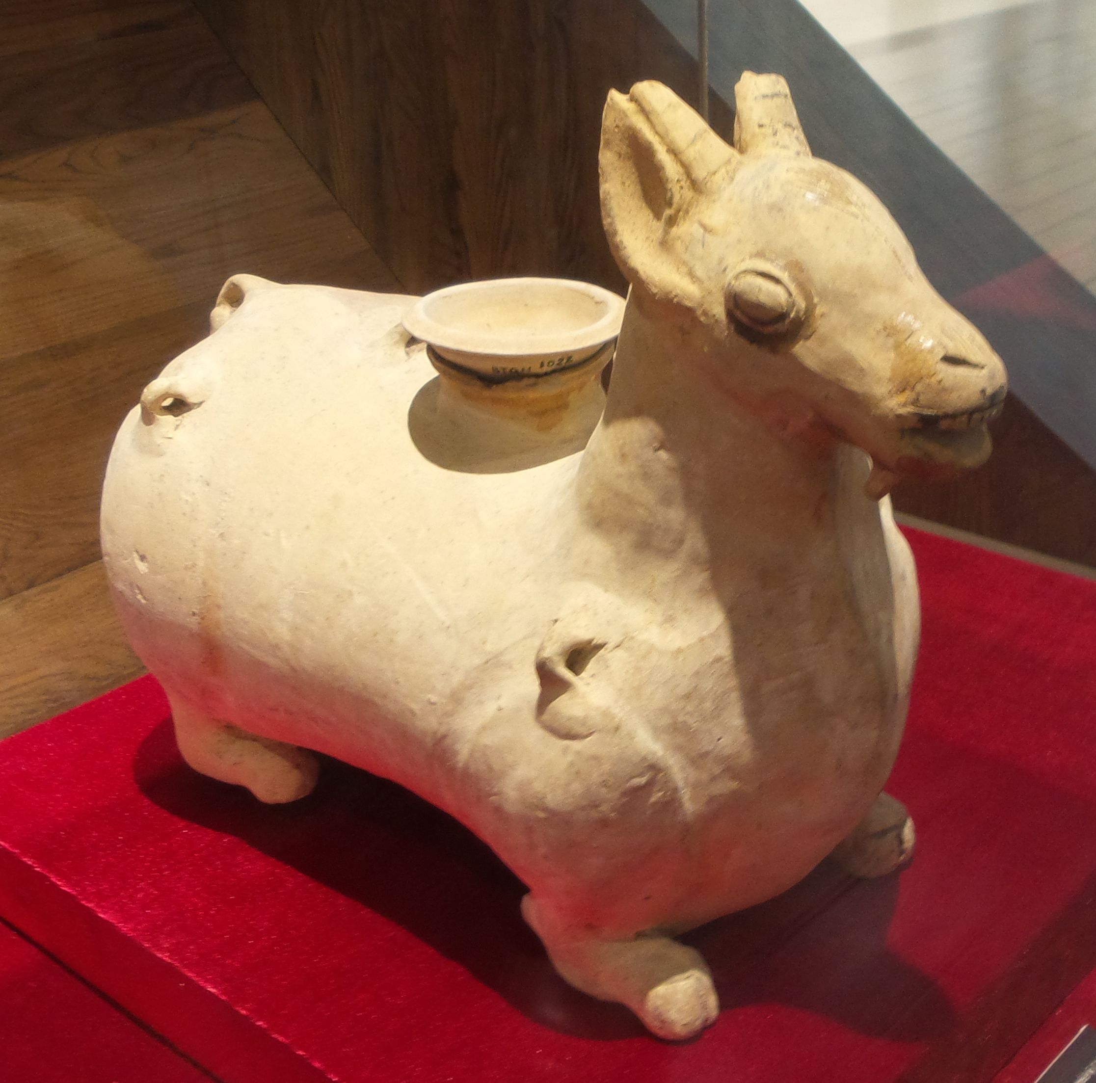 Tại Bảo tàng Quảng Ninh hiện đang trưng bày một đồ đựng gốm chế phỏng theo dáng một con dê nằm quỳ gối. Đây là con dê rất hiếm hoi trong nghệ thuật cổ đại Việt Nam. Với cặp sừng dựng đứng và nhất là chỏm râu cằm tiêu biểu khiến việc định danh con vật trở nên dễ dàng. Đồ đựng này có lẽ là một bình đựng rượu hoặc một loại nước dùng trong lễ dâng cúng thần linh. Trên lưng con dê là một vành miệng tròn đường kính khoảng 4cm, nhô cao gần 2cm, có một nắp đậy. Miệng dê có lỗ rót. Ở các vị trí như đôi vai, đôi mông và đuôi có gắn vành khuyên tạo thành chỗ móc dây treo. Hiện vật này được cho là khai quật trong các mộ gạch đầu Công nguyên ở vùng Mạo Khê (Quảng Ninh).