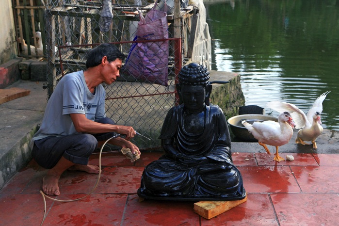 Trong ngôi miếu cổ của làng ấy có pho tượng Linh Lang Đại vương có thể đứng lên ngồi xuống. Cách ngôi miếu cổ khoảng một cây số ấy có một giếng bán nguyệt khi thả quả bưởi xuống thì quả bưởi sẽ trôi ra ngoài sông Hóa. Cứ như là cổ tích, cứ như là truyền thuyết giữa chốn làng quê hơn 700 năm nay đã và đang giữ gìn và phát triển nghề truyền thống của cha ông mình.