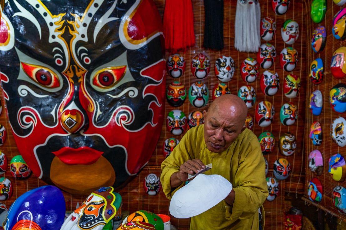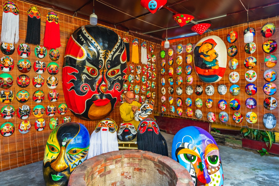 Đây chính là nơi nghệ nhân Bùi Quý Phong tạo tác và giới thiệu mặt nạ giấy bồi do chính tay ông vẽ. Ông đã dành hàng chục năm để làm nên những chiếc mặt nạ qua nhiều công đoạn từ đắp thạch cao hay xi măng, dán giấy bồi, quét vôi, phơi, vẽ, tô màu… Trong đó, cái khó nhất là thổi hồn vào từng chiếc mặt nạ qua từng nét vẽ để nó vừa sống động, vừa thể hiện đậm nét giá trị nghệ thuật dân gian và văn hóa Việt Nam.