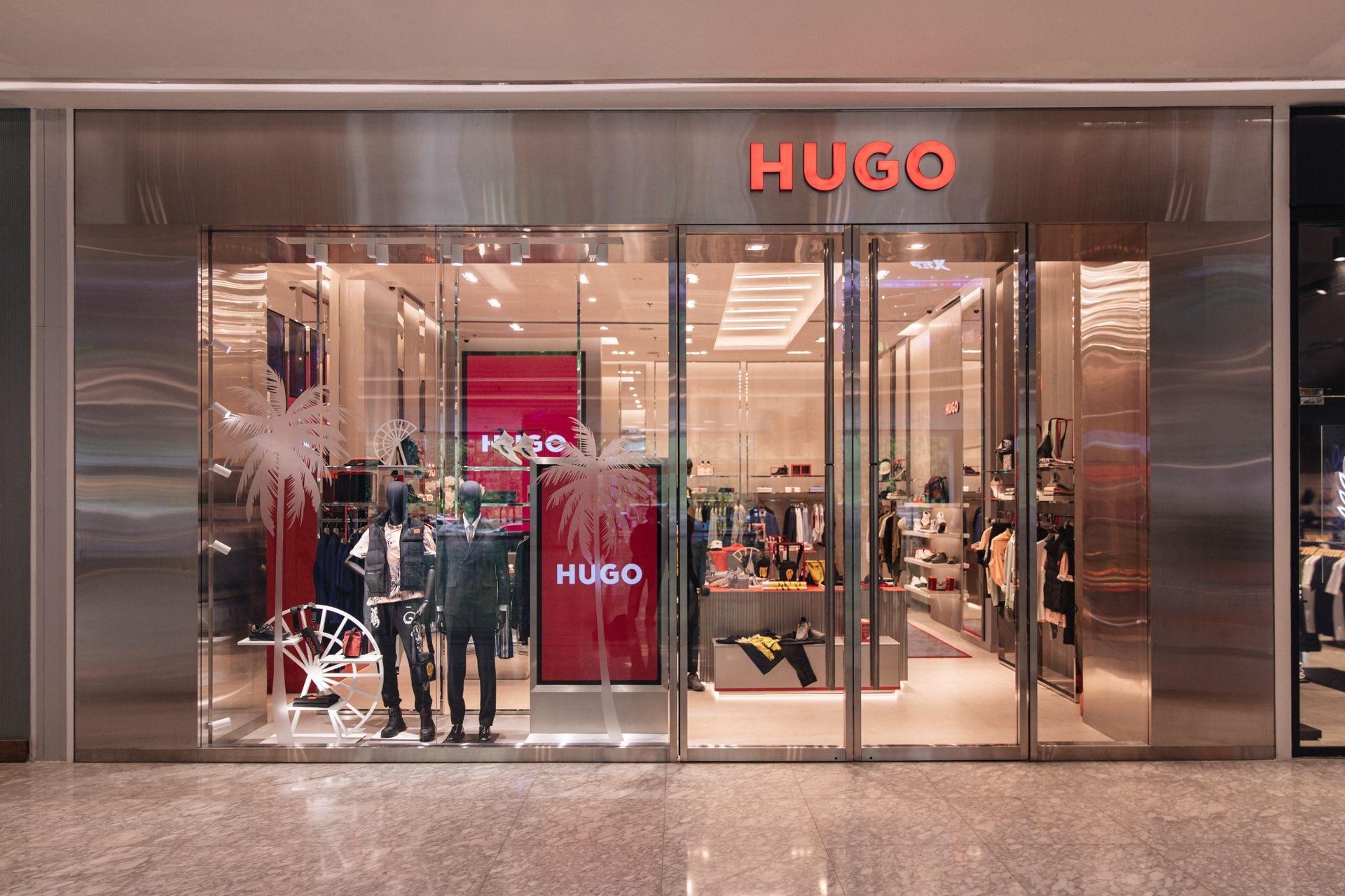 Tông màu xám kim loại là ấn tượng lớn nhất trong ngôn ngữ thiết kế của cửa hàng HUGO, khơi nguồn cảm hứng vị lai, trẻ trung nằm sâu trong DNA thời trang của các tín đồ nhà mốt. Sắc đỏ đầy kiêu hãnh – biểu tượng của nhà mốt cũng xuất hiện, đại diện cho chất bụi bặm của xu hướng thời trang đường phố, một phần cốt lõi đã góp phần định hình và đồng hành cùng thương hiệu HUGO những năm gần đây.