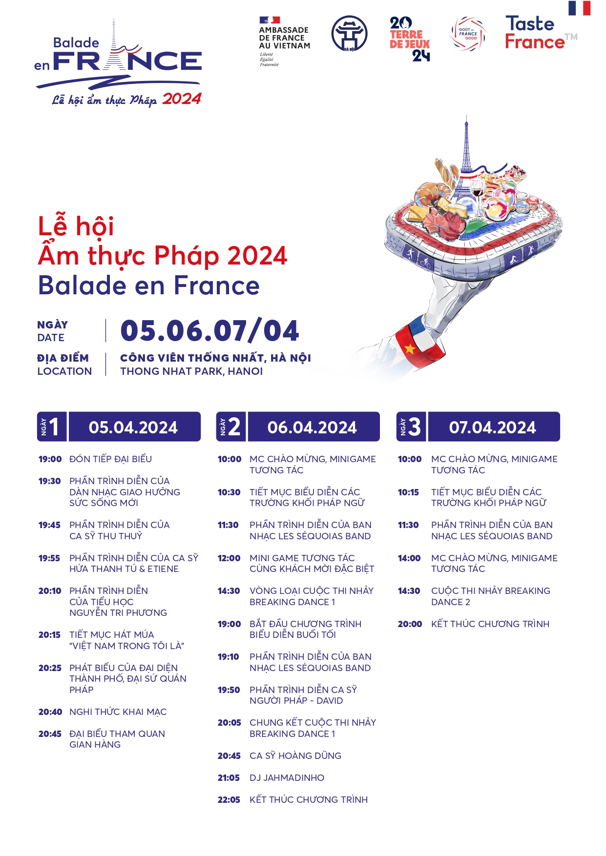 Tiếp nối thành công của ba mùa sự kiện trước vào các năm 2018, 2020 và 2023, Lễ hội ẩm thực Pháp lớn nhất tại Việt Nam mang tên “Balade en France” sẽ quay trở lại Thủ đô từ ngày 5 đến ngày 7 tháng 4 năm 2024. Dưới sự đồng chủ trì của Đại sứ quán Pháp tại Việt Nam và Ủy ban Nhân dân Thành phố Hà Nội, lễ hội sẽ lần đầu tiên được tổ chức tại Công viên Thống Nhất, với số lượng gian hàng tăng gấp rưỡi năm trước.