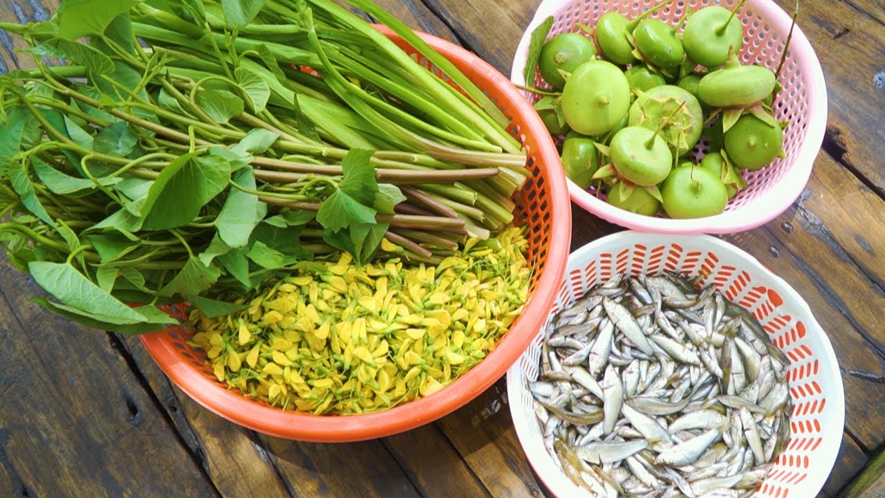 Và canh chua chính là món ăn hoàn hảo để kết hợp các nguyên liệu trên. Trái bứa với hương thơm đặc trưng, vị chua thanh, chỉ cần duy nhất một trái là đủ nấu nồi canh chua năm sáu người ăn. Trước tiên, bắt nồi nước sôi, cho trái bứa cắt đôi vào, nấu mềm thì vớt ra. Tiếp đến là các loại rau như bông súng, điên điển vào nấu nhanh. Cá linh thì cho sau cùng vì cá non thịt mềm rất nhanh chín. Cuối cùng là thêm rau nêm như ngò gai, rau ôm, là hoàn thành nồi canh chua. Đã có canh chua thì không thể thiếu món cá linh kho. Với cá kho thì chỉ cần nửa trái bứa là đã đủ độ chua.