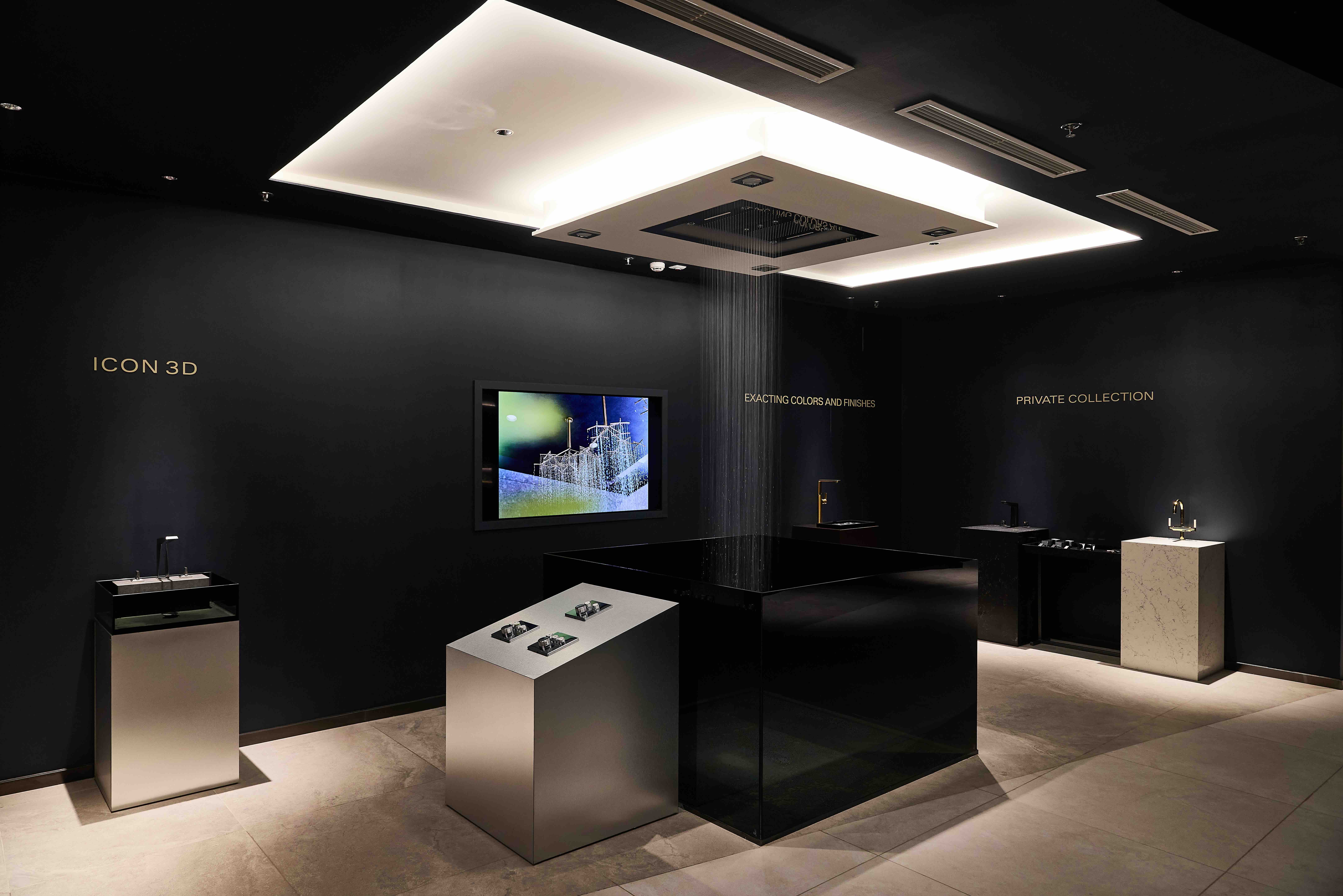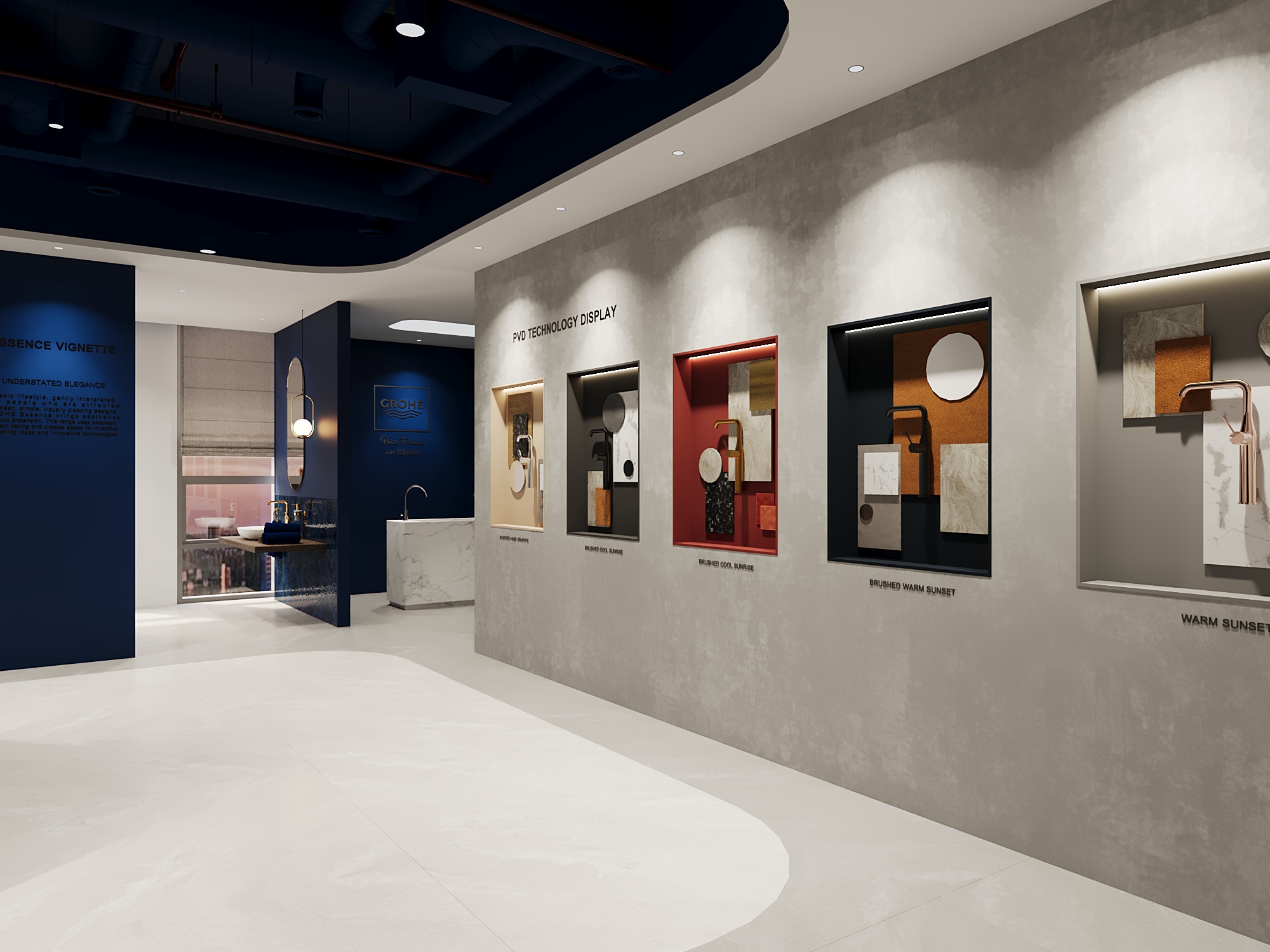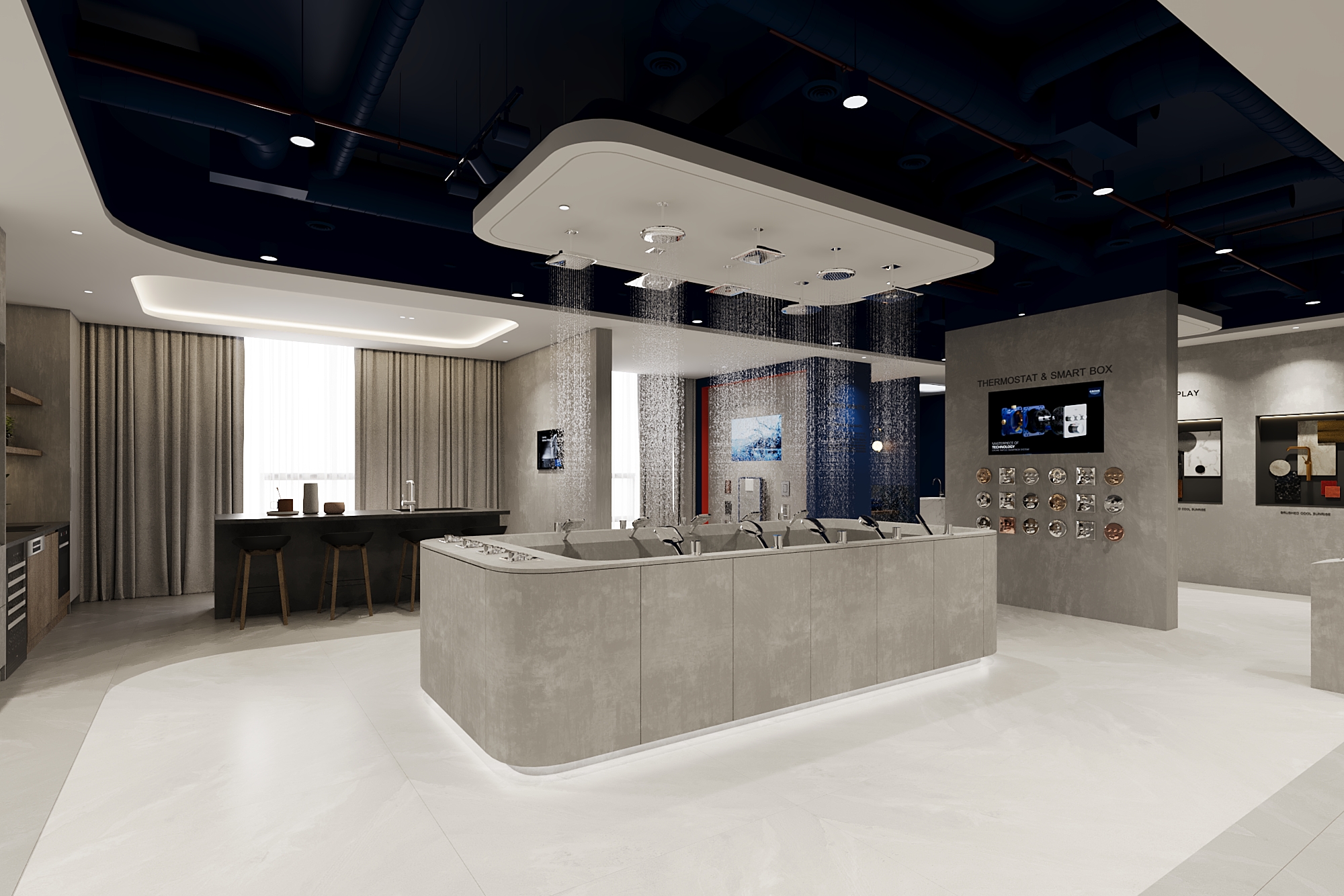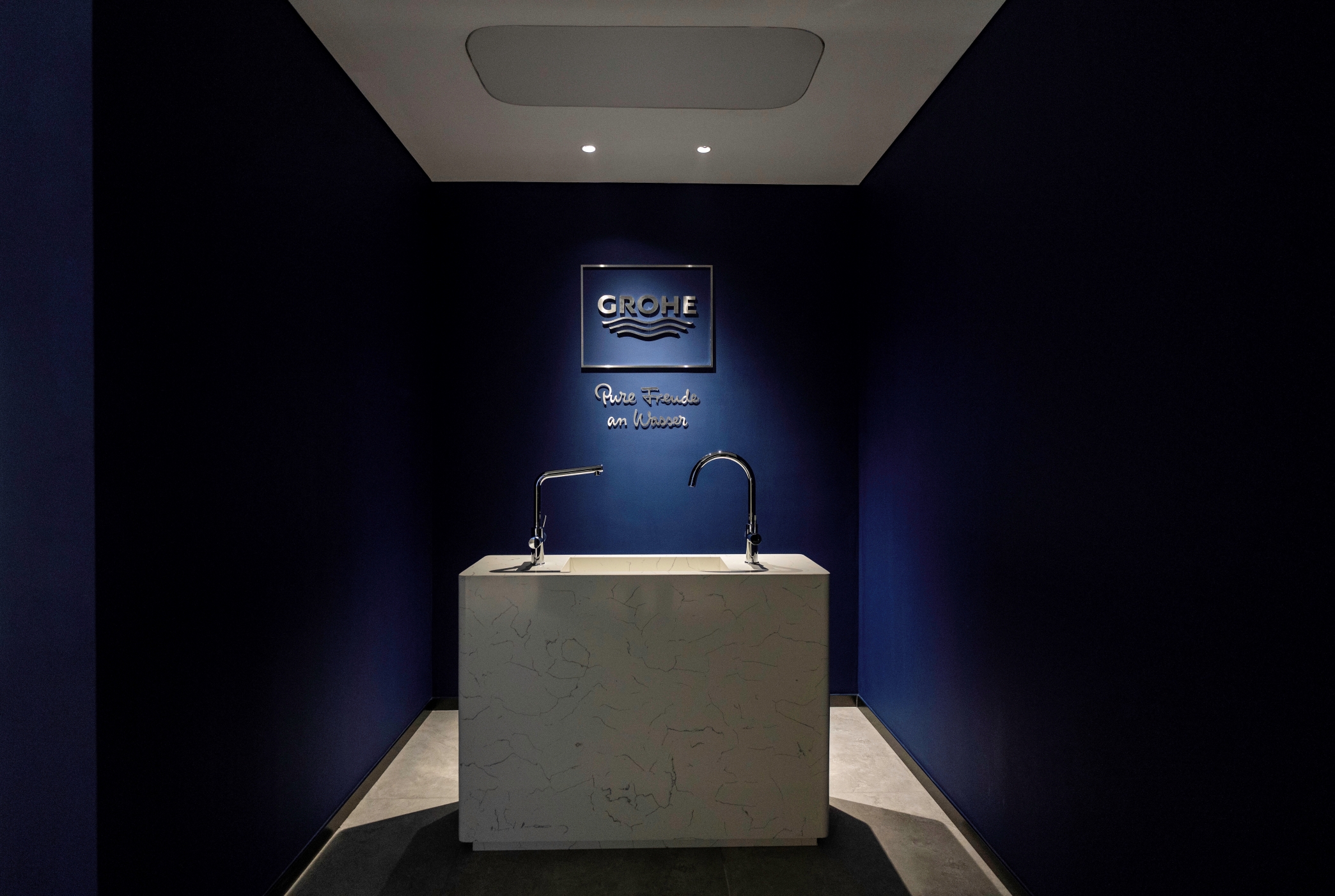 Không gian còn lại thuộc về GROHE – thương hiệu thiết bị vệ sinh cao cấp đến từ Đức, mời gọi khách hàng bước vào không gian trải nghiệm sang trọng mang hơi hướng châu Âu.