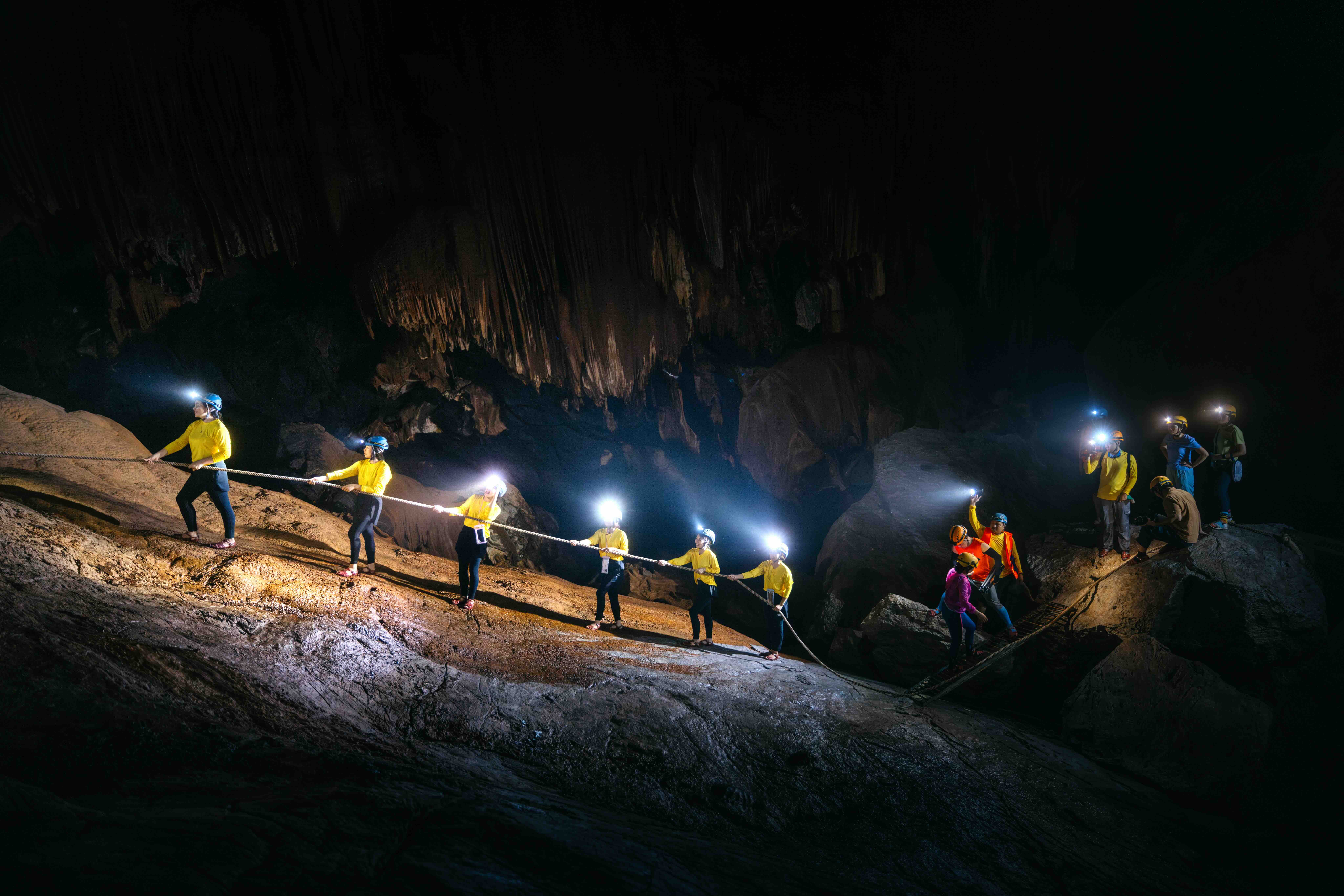 Du khách phải vận dụng nhiều kĩ năng di chuyển trong hang động