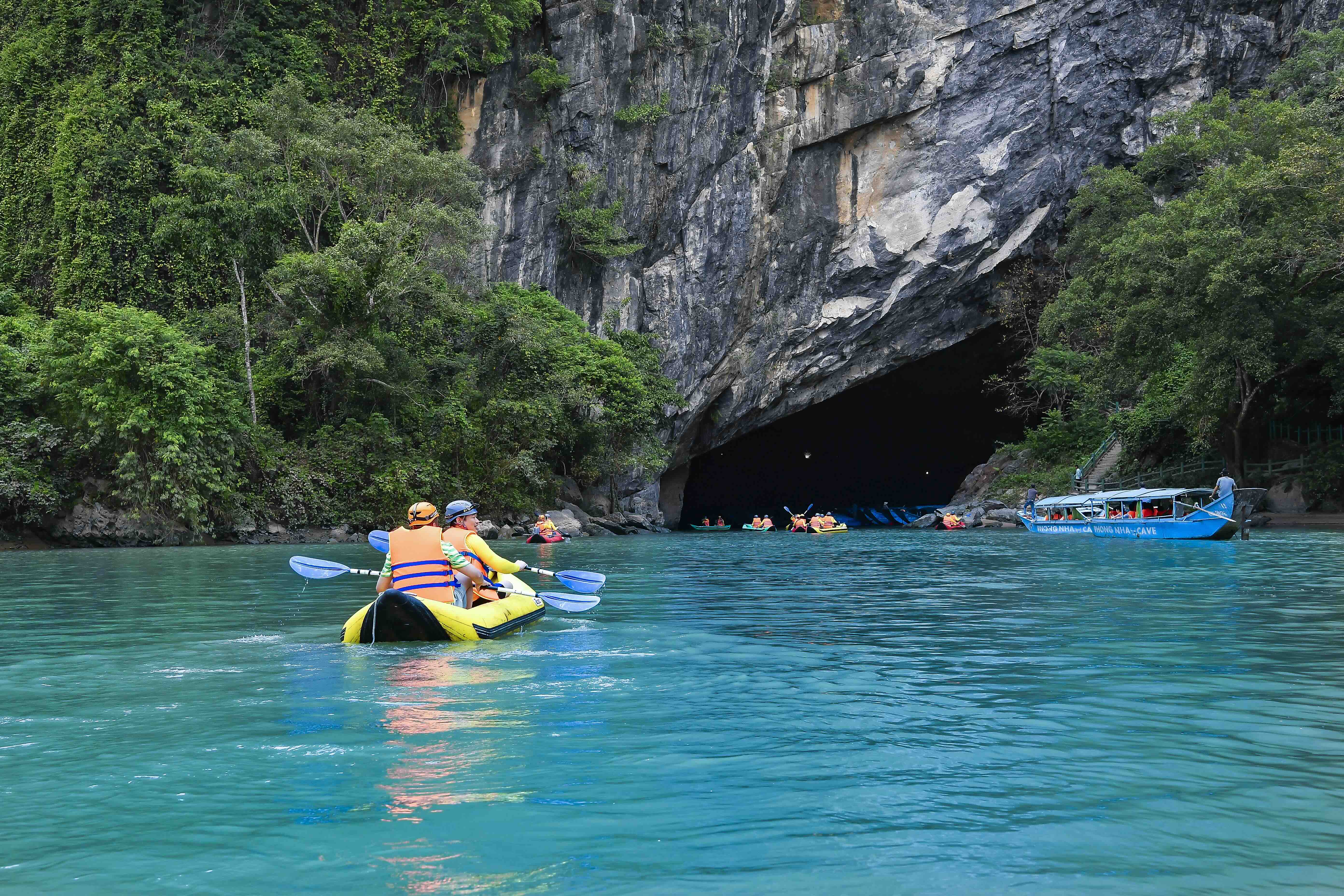 Ngược dòng sông Son, thuyền máy đưa đoàn chúng tôi lướt trên mặt nước xanh ngọc, hai bên là làng quê thanh bình với mái ngói đỏ, trẻ nhỏ nô đùa và ngư dân thả lưới trong nắng sớm. Càng đến gần cửa động, cảnh vật càng trở nên hùng vĩ. Một số du khách chọn chuyển sang kayak để tận hưởng cảm giác chủ động giữa dòng nước mát. Anh Nguyễn Hải – nhiếp ảnh gia đến từ Quảng Trị, người dẫn đoàn – hồ hởi nói: “Tour này rất đặc biệt. Mỗi người sẽ vừa chèo kayak, vừa leo, bơi và đi bộ xuyên lòng núi. Tổng quãng đường cả đi lẫn về khoảng 9 km”. Sau khi trang bị áo phao, mũ bảo hiểm, đèn pin và giày chống trượt, tôi cùng bạn đồng hành bắt đầu chèo kayak. “Giữ nhịp đều, quan sát đồng đội,” lời nhắc của anh Hải khiến tim tôi đập nhanh hơn. Cả đoàn bắt đầu tiến vào cửa hang, cuộc đua chèo kayak trong tiếng cổ vũ khiến ai cũng phấn khích.