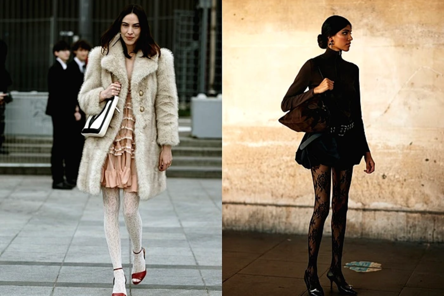 Để tránh sự “quá đà”, hãy phối tất ren với trang phục mang cấu trúc mạnh như váy da, blazer dạ hay denim cứng cáp. Sự đối lập giữa mềm và cứng khiến tổng thể sành điệu hơn mà không mất đi sự tinh tế. Và với tất ren, giày mũi nhọn hoặc slingback luôn là lựa chọn hoàn hảo giúp đôi chân trở nên thanh thoát, sắc sảo.