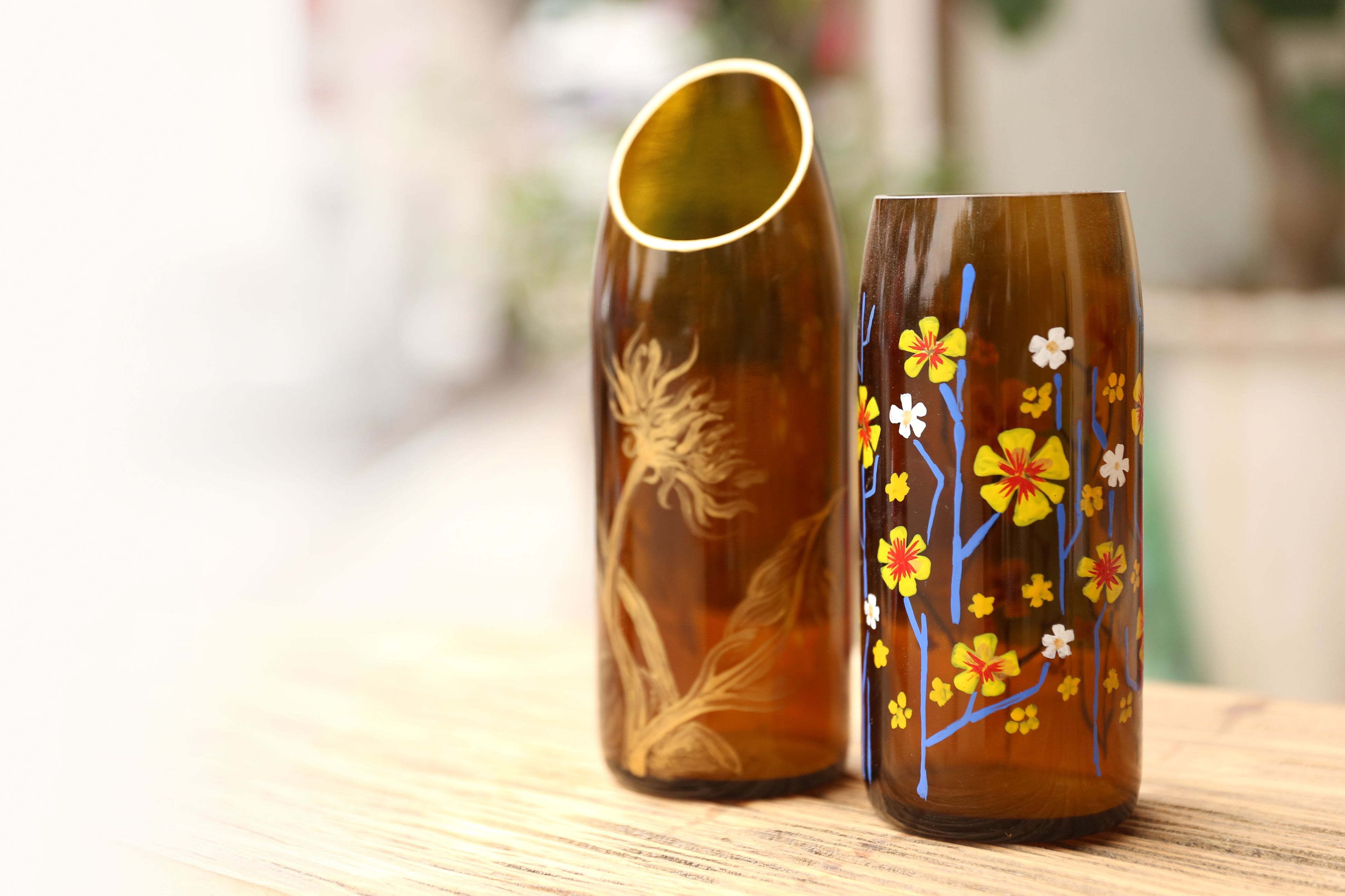 Cũng chung niềm đam mê với môn nghệ thuật vẽ thủy tinh, có những cơ sở chuyên vẽ thủy tinh từ đồ “tái chế”. những chai lọ cũ không sử dụng, bị chủ nhân đem vứt đi, được tái chế, làm mới và dùng trong trang trí. Đó là cách mà 2 nghệ sĩ trẻ ở hà nội là Đinh iên tâm và nguyễn Diệu úy sử dụng trong chiến dịch “Giải cứu ve chai”. Bước vào không gian sản xuất của anh chị, người xem có thể thấy la liệt các vỏ chai lọ cũ với đủ những hình dáng kích cỡ khác nhau. Không ai có thể nghĩ được rằng từ những chai lọ tưởng như vô dụng này mà rất nhiều sản phẩm như đèn ngủ, bình cắm hoa, chậu cây cảnh, những chiếc cốc uống nước được tạo ra, trông “khác biệt”. từ đam mê dành cho những chai lọ thủy tinh, xưởng thủy tinh nhỏ trong lòng thành phố mang tên “Lọ mọ xưởng” của chị nguyễn ị yến châu lại có một phong cách riêng. Không đơn thuần là vẽ và trang trí trên những cốc, lọ thủy tinh, nơi đây còn mở những lớp học vẽ trên thủy tinh dành cho khách hàng. chỉ cần nửa ngày ở lớp học, người chơi có thể tạo ra riêng 1 sản phẩm từ chính mẫu vật thủy tinh mang đến. Lớp học không chỉ có các bạn trẻ người Việt đến mà còn có rất nhiều người nước ngoài sinh sống ở hà nội dành thời gian để đến vẽ. eo như chủ nhân của xưởng, có rất nhiều công ty đến đặt đồ tặng khách nước ngoài với những họa tiết trang trí mang phong cách Việt nam như những thiếu nữ chơi đàn dân tộc, những con cò trên khung cảnh làng quê… Ý nghĩa hơn là toàn bộ số tiền từ bán thủy tinh sẽ được dành cho quỹ “chăn ấm” khu vực miền núi phía Bắc.
