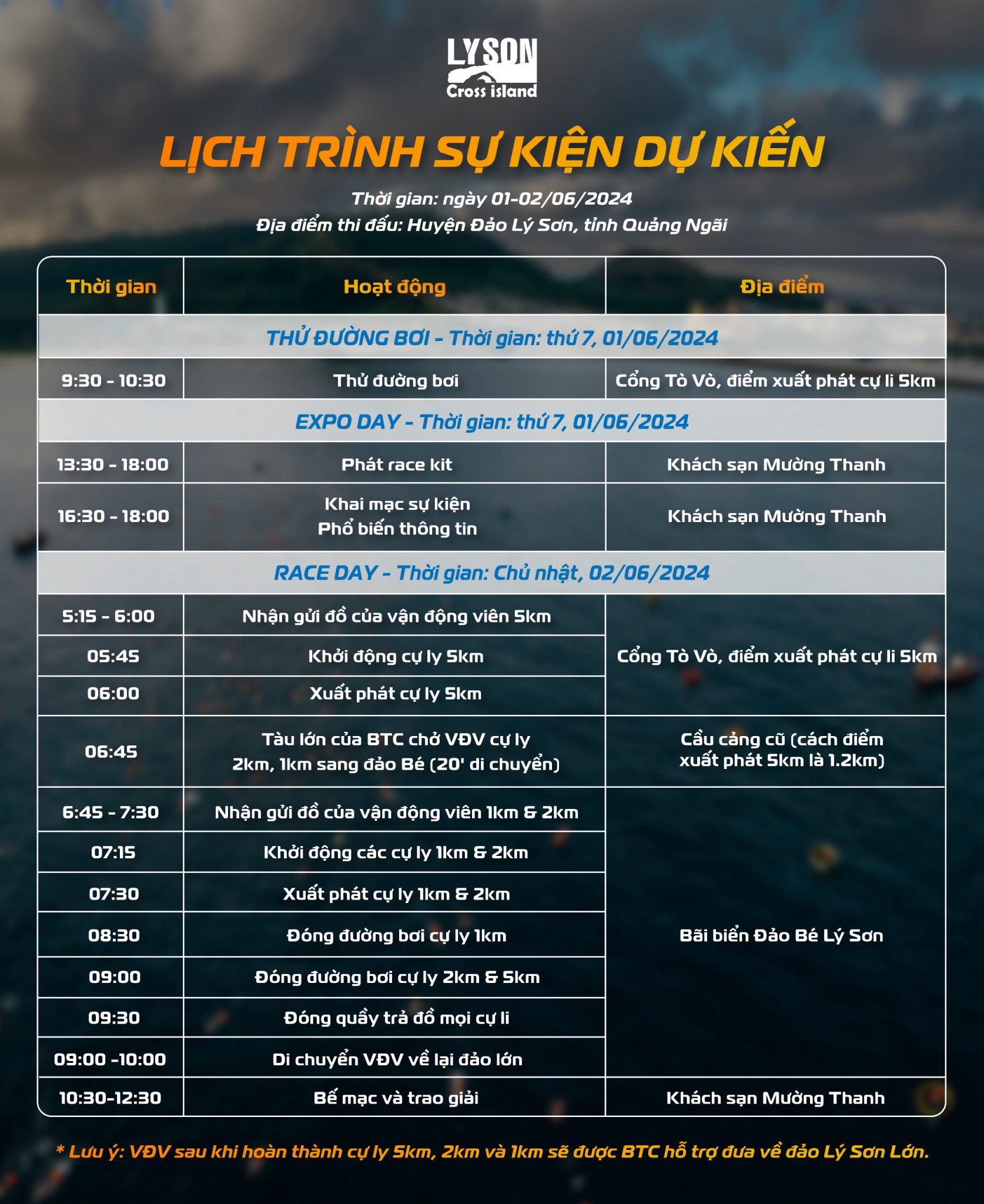 Năm nay, giải đấu diễn ra trong 02 ngày 01-02/06/2024 (thứ Bảy và Chủ nhật) với các hoạt động chính là thử đường bơi, khai mạc và thi đấu. Tại Lý Sơn Cross Island 2024, 5km được xem là thử thách lớn nhất, vì quá trình bơi vượt biển, các VĐV phải bơi qua các khu vực có nhiều dòng chảy khác nhau trên biển ở giữa hai hòn đảo.