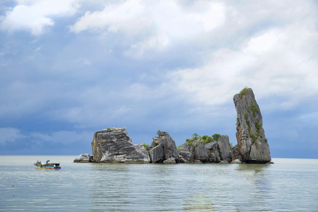 Thắng cảnh chùa Hang – hòn Phụ Tử nằm xa nhất từ trung tâm thành phố, cách khoảng 35km. Tôi theo con đường ôm bờ biển đi giữa những làn gió mát lành mang vị mặn mòi, băng qua những hàng cây cổ thụ cao vút xanh phủ bóng mát xuống con đường nhỏ uốn lượn. Chùa Hang là cái tên dân dã của chùa Hải Sơn, bởi chùa thờ Phật trong hang đá tự nhiên ngay sát bờ biển, với các thạch nhũ nhiều hình dạng, như động Phong Nha thu nhỏ. Ra khỏi chùa trong hang, đến bờ biển là được ngắm một phần còn lại của hòn Phụ Tử – biểu tượng của du lịch Kiên Giang. Trước đây, hòn Phụ Tử là hai khối đá cao vài chục mét đứng cạnh nhau trên một bệ đá chung, nổi lên trên mặt biển. Tiếc rằng, vào năm 2006, hòn Phụ đã bị gãy đổ xuống biển, chỉ còn lại hòn Tử.