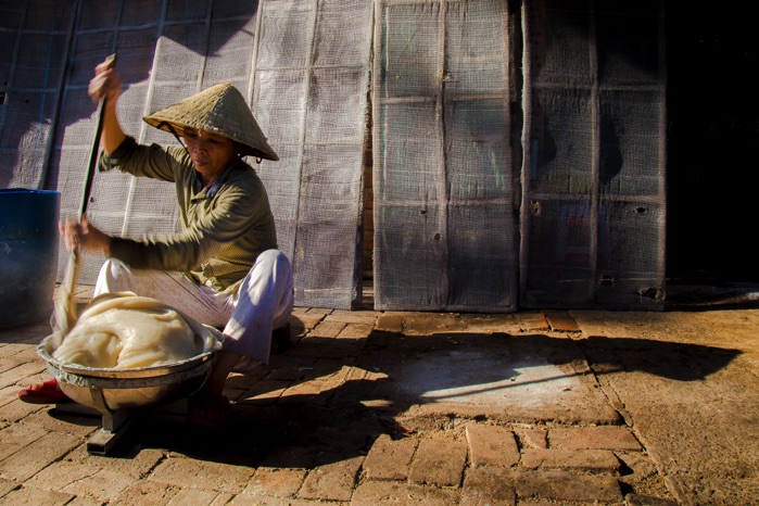 Bắt đầu từ khâu làm bột: củ sắn được cạo sạch vỏ, sắn phải trắng và không bị mốc. Sau đó, người thợ cho sắn vào máy, xay thành bột mịn, đổ nước vào ngâm với tỉ lệ khoảng 60 lít nước thì ngâm với 14 kg bột, quấy đều và sau 1 tiếng đổ nước cũ, thay nước mới và tiếp tục quấy. Vì quấy nhiều lần nên bột sắn được ngâm hai ngày hai đêm mới đủ thời gian để làm bột trắng hơn, ngon hơn và không còn mùi hôi.