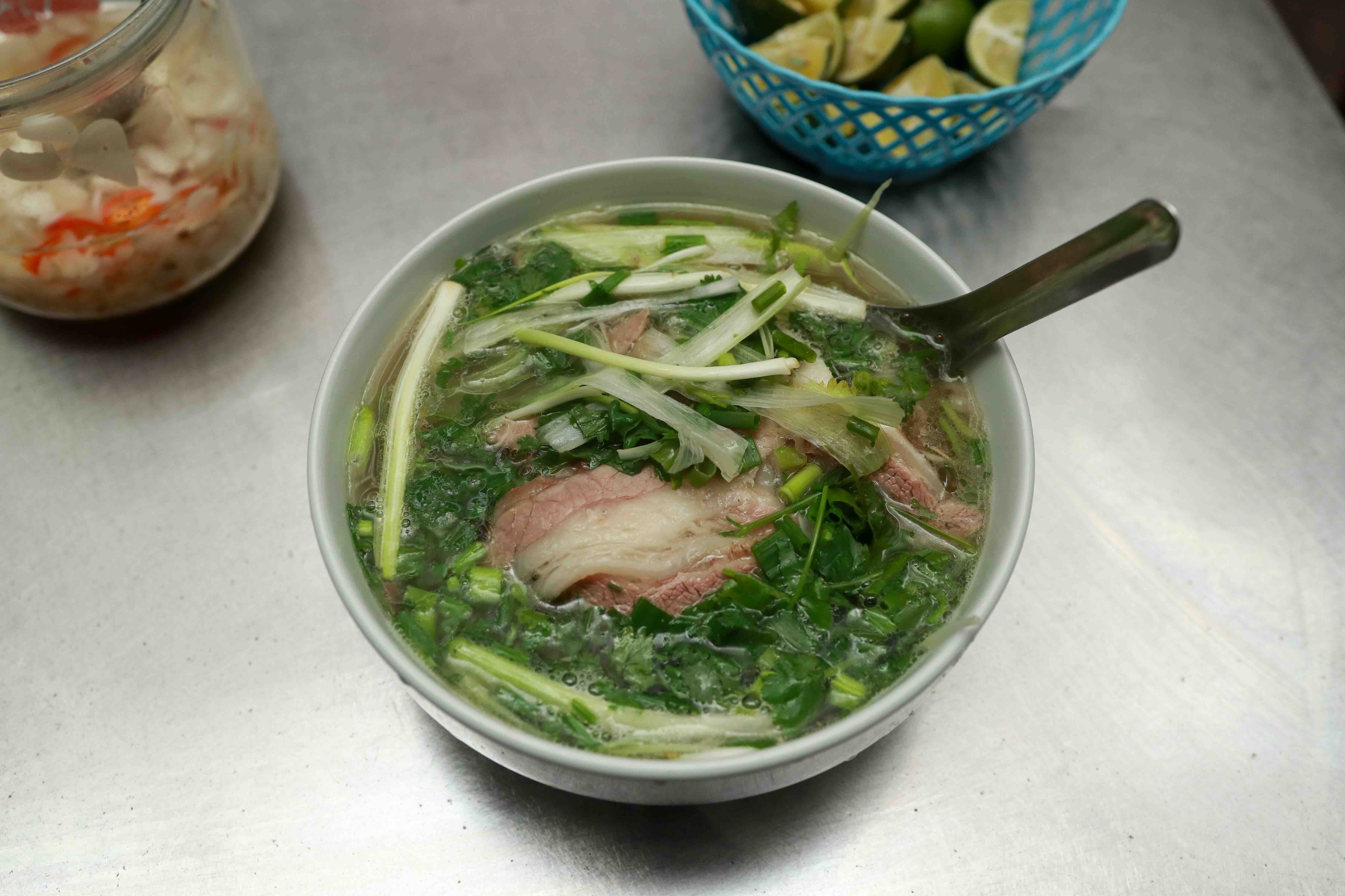 Trong những ngày đông, món được gọi nhiều nhất là phở tái gầu. Gầu được luộc vừa chín tới, giòn, béo nhưng không ngấy, còn miếng tái thì mềm và ngọt. Nước phở trong, nóng, chan ngập bánh phở sợi nhỏ – ăn chậm rãi mới thấy rõ vị ngọt từ xương, không cần nhiều gia vị. Một bát phở tài gầu, thêm hai chiếc quẩy giòn, một cốc trà đá, tất cả gói gọn trong 50.000 đồng – mức giá hiếm gặp giữa khu phố cổ vào thời điểm này.