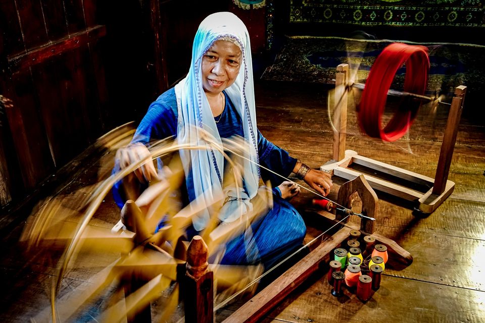 Một buổi sớm ban mai đầy nắng đã dẫn chúng tôi đến làng dệt thổ cẩm của người Chăm tại xã Châu Phong, cách thánh đường Masjid Nia’mah chừng vài trăm mét theo hướng ra sông Hậu. Ánh sáng lấp lánh trên những khung cửi gỗ đã bạc màu theo năm tháng. Từ trong những ngôi nhà sàn, tiếng thoi đưa vang lên đều đều như một điệp khúc bên sông. Ấy là thanh âm của một làng nghề đã cùng lớn lên với đời sống của đồng bào Chăm nơi vùng đất Tân Châu này – nghề dệt thổ cẩm.
