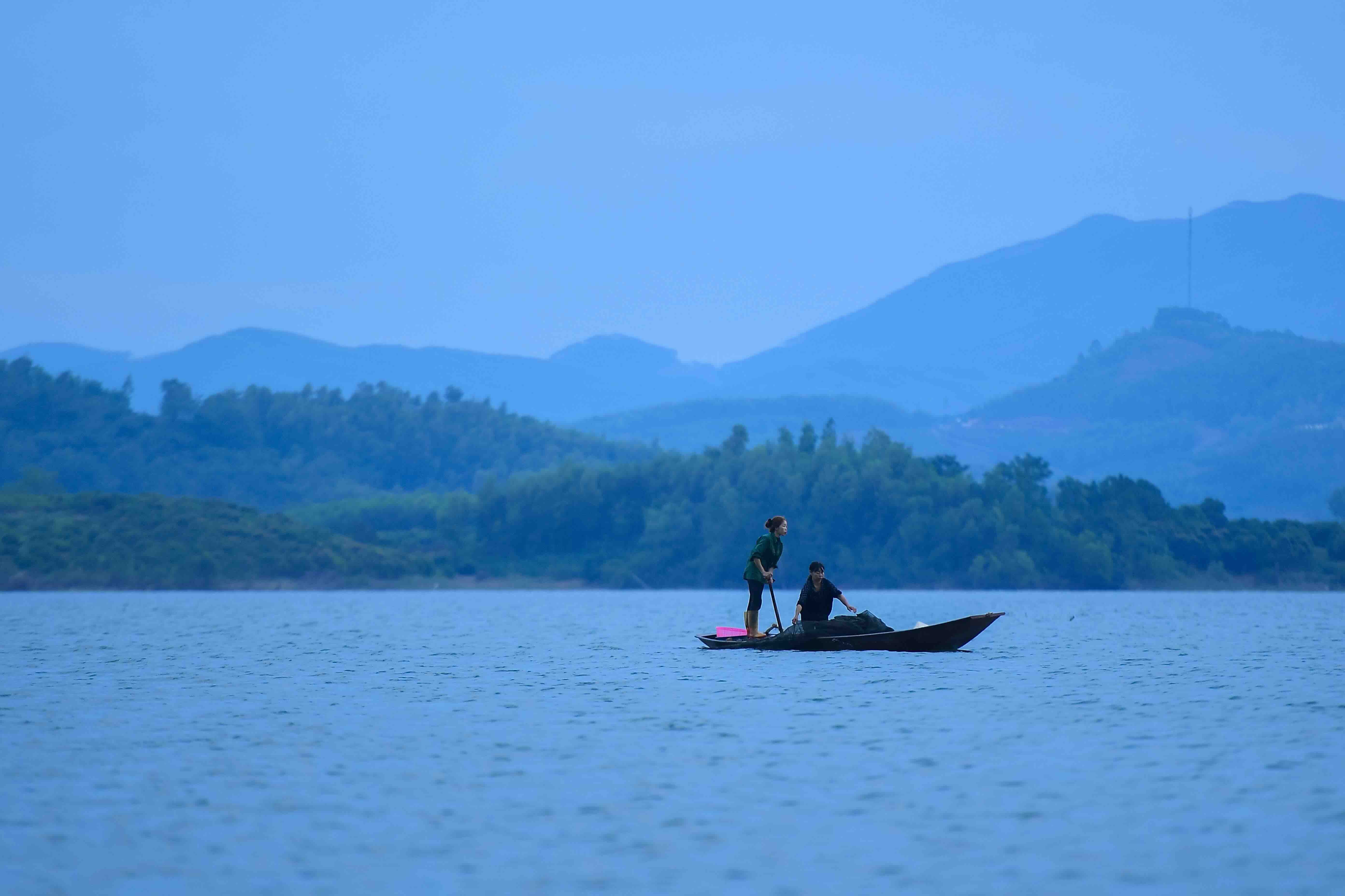 Nắng chiều soi bóng mặt gương xanh, thuyền xuôi về bến, lòng tôi lại vang lên nhịp điệu sông nước của Hồ trên núi: