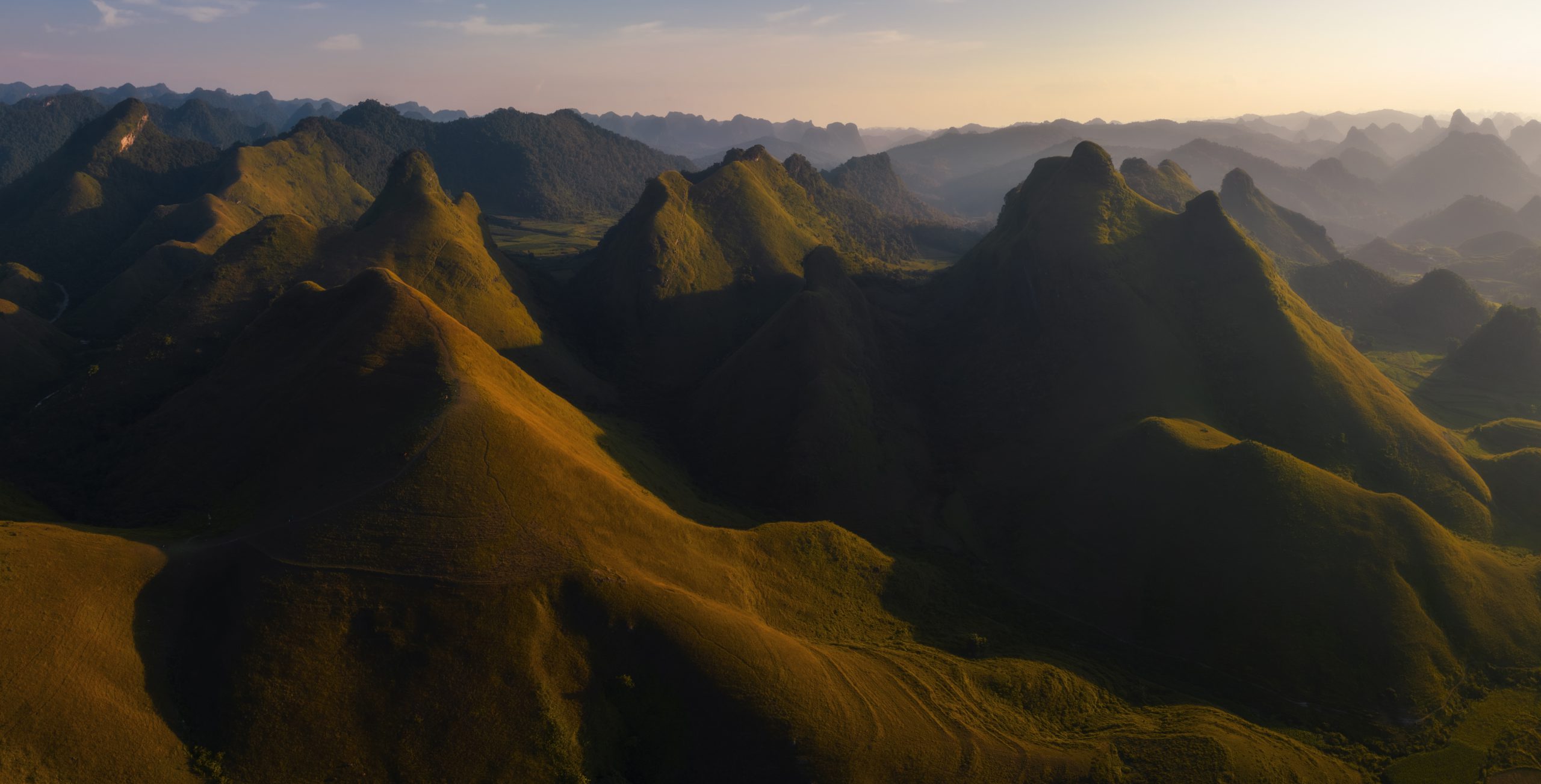 Điểm dừng chân đầu tiên là khu vực đồi cỏ Ba Quáng, xã Vinh Quý, huyện Hạ Lang. Chỉ sau 15 phút đi bộ lên đỉnh đồi, tôi choáng ngợp trước khung cảnh ở phía trước tầm mắt. Những đồi cỏ vàng rộm nối tiếp nhau trên nền núi đồi xa xa. Cái màu của hoàng hôn hoang hoải trong tiết trời se sắt khiến cho ngọn đồi chuyển thành “màu cỏ cháy”. Lác đác lều trại của vài nhóm bạn trẻ đã được dựng lên. Tôi cùng người bạn đồng hành là cậu con trai cũng nhanh chóng dựng căn lều xinh xắn và chuẩn bị củi để nhóm lửa sưởi ấm.