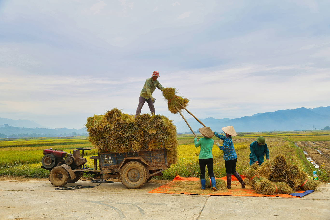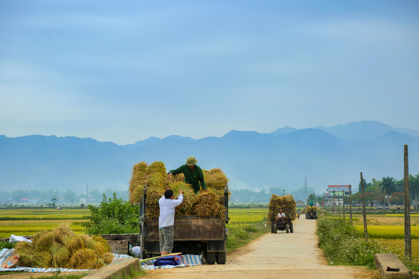 Đây đó xuất hiện những chiếc máy gặt đập liên hợp trên những ô ruộng, với những bao lúa hạt được dựng ngay ngắn thành hàng. Những bó bông lúa được ngả xuống thửa ruông, sau đó bà con gánh dọc theo những đường bờ về điểm tập kết. Trên con đường bê tông nhỏ thẳng tắp, những nông dân khỏe khoắn vừa tươi cười trò chuyện, vừa dùng cặp đòn xóc nhấc bổng bó lúa chuyền lên thùng xe tải, bằng những động tác đều đặn, chính xác và đẹp như vũ điệu ngày mùa trong buổi chiều giữa mênh mông đồng vàng.