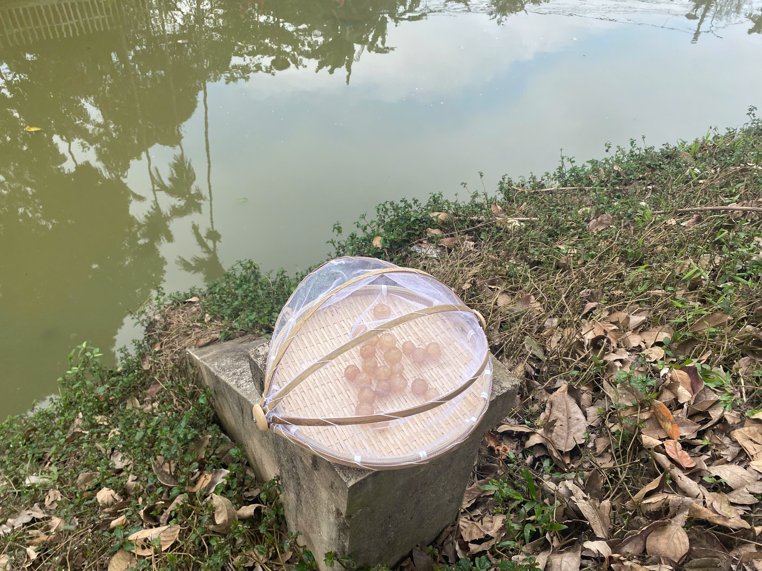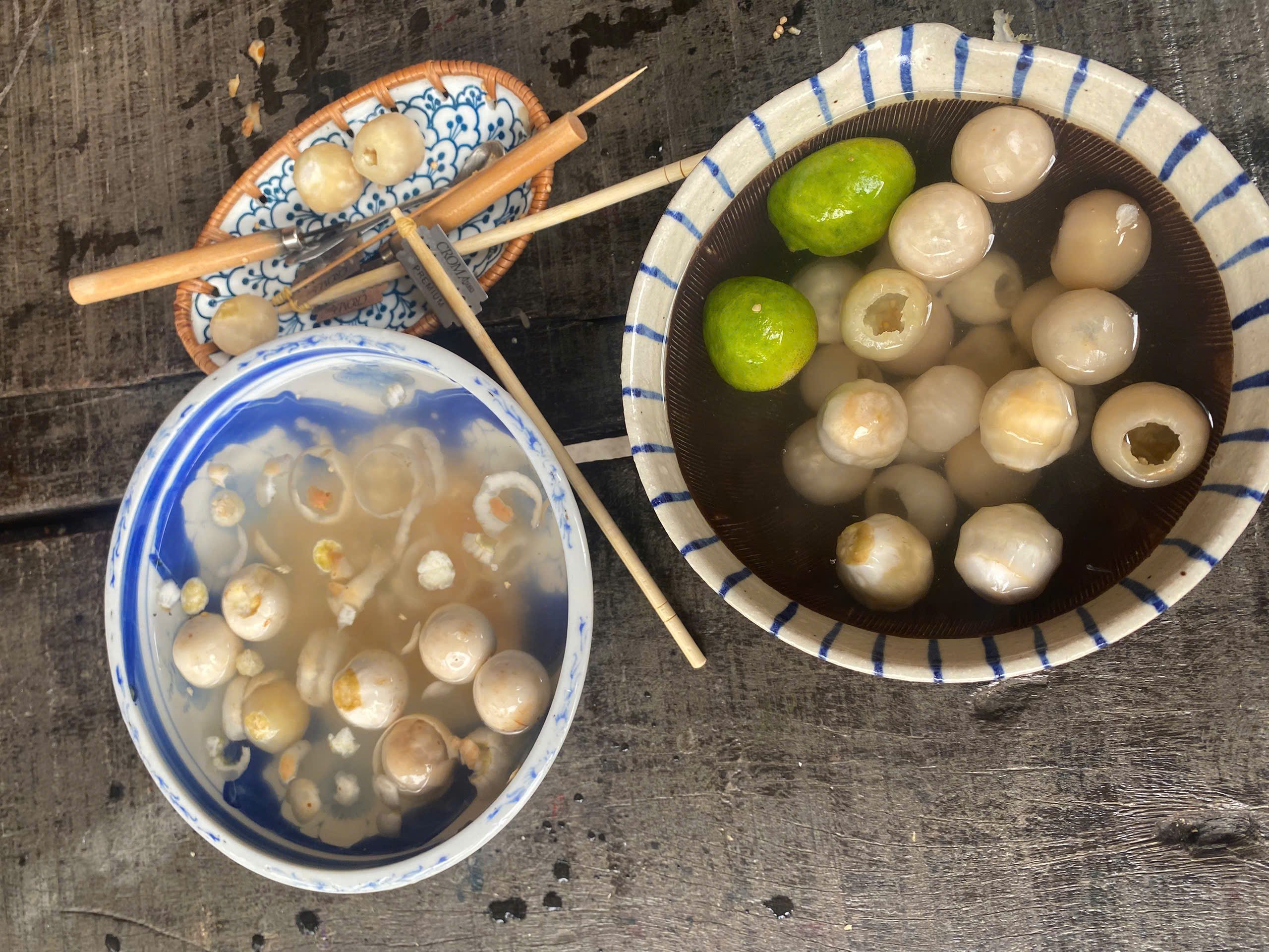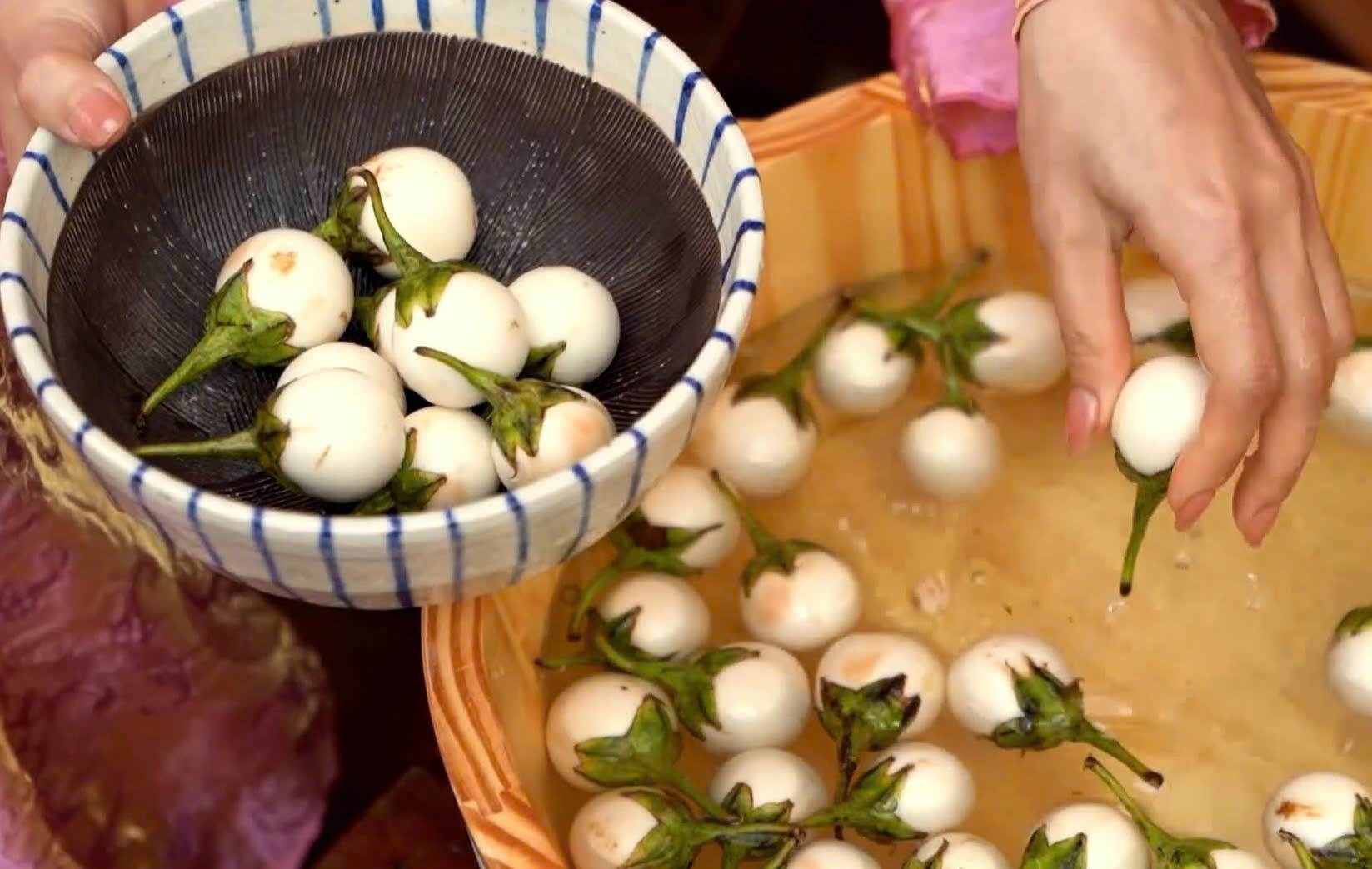 Cà tiếp tục được ngâm trong nước pha cốt chanh, thay nước liên tục để khử mùi hăng và giúp quả cà chuyển dần sang màu trắng trong. Khi ấy, cà không còn là cà pháo quen thuộc nữa, mà đã bắt đầu mang dáng dấp của một “vật phẩm” dành cho Tết. Sau đó, cà được chần qua phèn chua và rượu trắng – hai nguyên liệu tưởng chừng mộc mạc nhưng lại giữ vai trò quyết định độ giòn và độ trong của mứt cà thành phẩm.