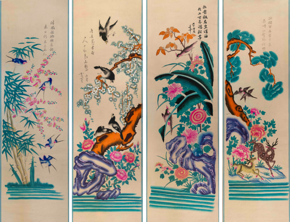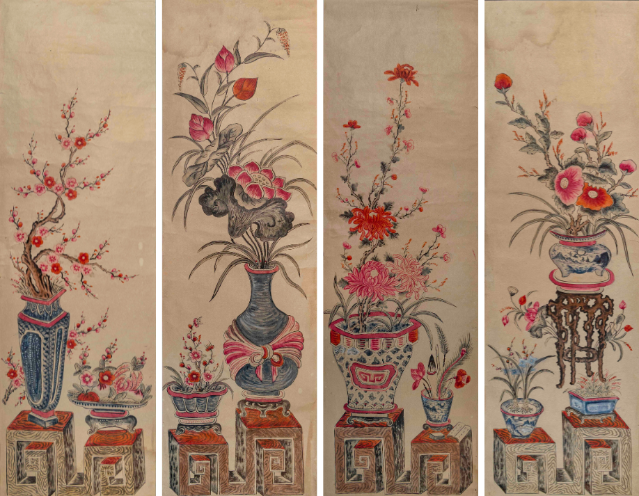 Bộ tranh thứ nhất là bộ Tứ quý thuộc dòng tranh Hàng Trống thể hiện 4 bình hoa đào, hoa sen, hoa cúc và hoa sơn trà, tương ứng với 4 mùa. Người xưa đã dùng phép ẩn dụ hình tượng chiếc bình (trong nghĩa bình hoa) đồng âm đồng thanh với chữ bình (trong cụm từ bình an). Trong bình cắm 4 loại hoa quý biểu thị ý “bình hòa thị phúc” tức ôn hòa là phúc. Để bộ tranh không đơn điệu và còn có thể gửi gắm nhiều ý nghĩa biểu trưng khác, một cách duyên dáng, nghệ nhân dân gian đã “bài trí” những bình hoa này trên các chiếc ghế chân cao hay chiếc đôn hình hồi văn tượng trưng cho mưa gió tưới nhuần vạn vật, ghế chân cao và bày kèm theo đó đĩa quả, chậu hoa nhỏ khác hay các vật trang trí đều mang ý nghĩa phúc, lộc như quả phật thủ, hoa thủy tiên, hoa lan…