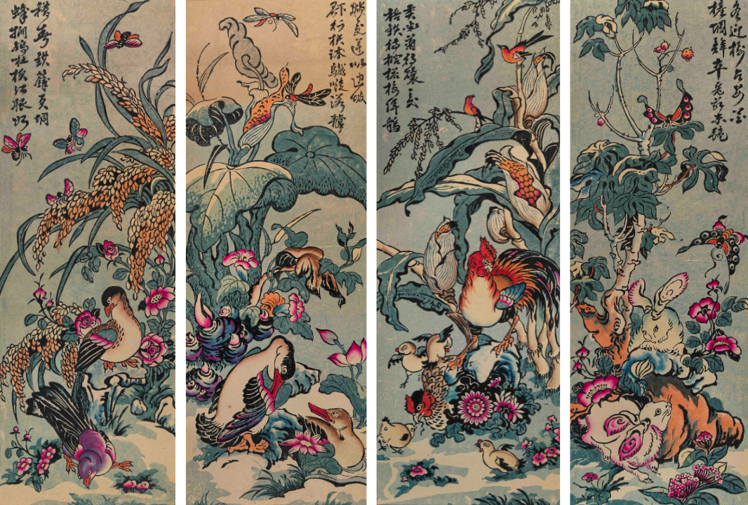 Một trong những bộ tranh tứ bình độc đáo và có dấu ấn Việt rõ nhất, không chỉ ở hình tượng nghệ thuật mà còn ở dòng thơ chữ Nôm – chữ viết của người Việt xưa là bộ tranh Tứ quý thuộc dòng tranh dân gian Đông Hồ. Bộ tranh còn có tên gọi nôm na là “Lúa, ngô, khoai, sắn”.