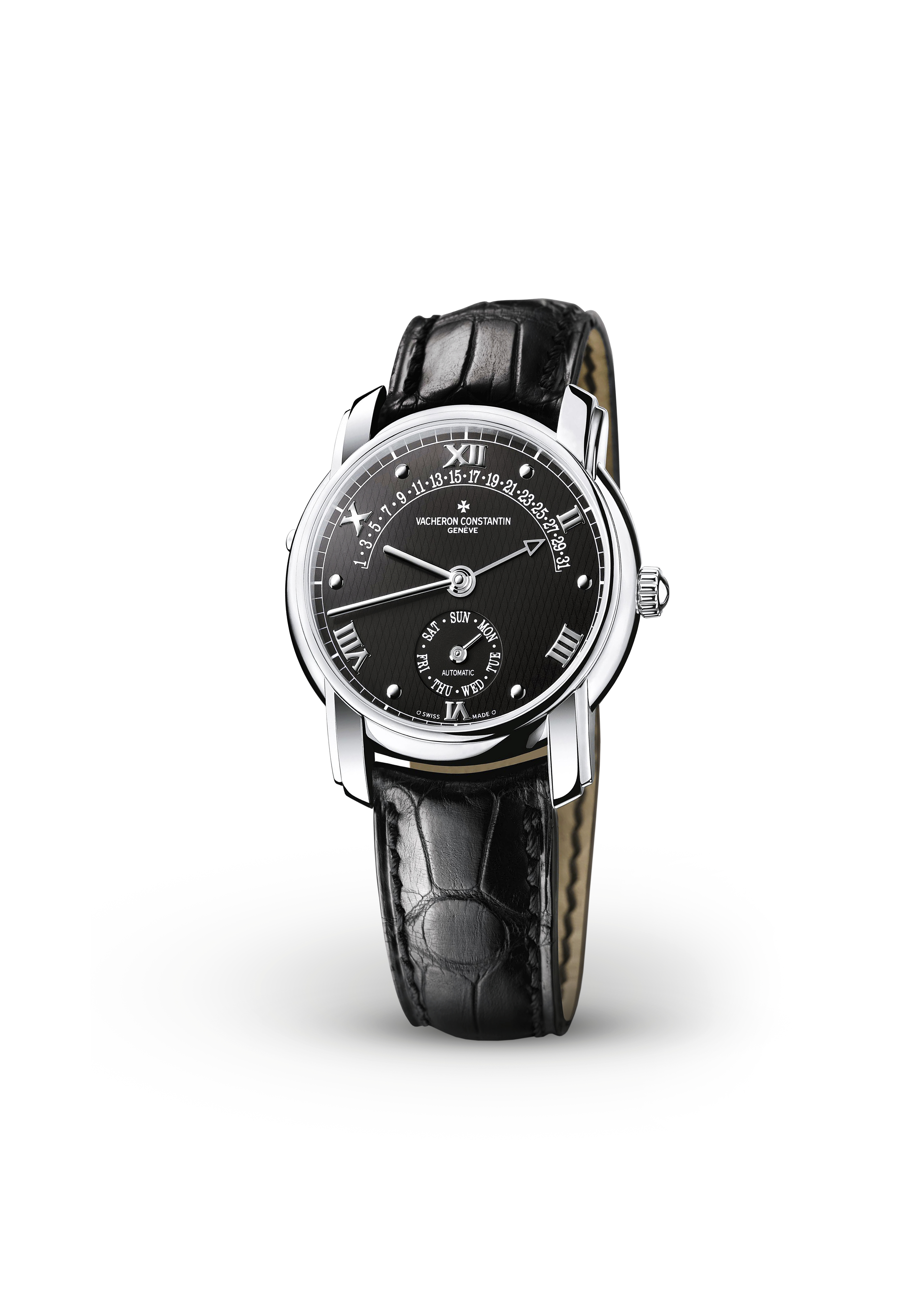 Hai chỉ báo lùi (thứ và ngày) được làm bằng kim thép xanh theo truyền thống, trong khi giờ và phút được hiển thị bằng kim vàng trắng 18K. Theo phong cách cổ điển của những năm 1950, phần sau được uốn cong một cách tinh tế để phù hợp với hình dạng của mặt số hình vòm với độ phản chiếu mạnh mẽ của nó. Đường phút ngoại vi có hạt tròn cũng được lấy cảm hứng từ thời đại này trong một phiên bản được xem xét lại. Ngay từ cái nhìn đầu tiên, chiếc đồng hồ này thể hiện phong cách tinh tế do Vacheron Constantin nuôi dưỡng.